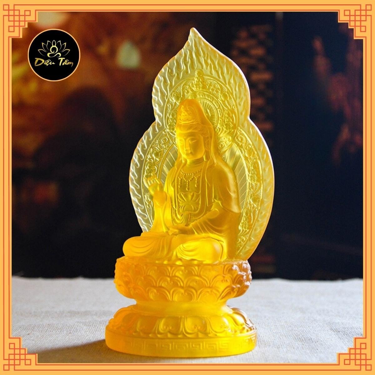 Tượng Phật Quan Âm Đá Lưu Ly Vàng Mới để trong xe hơi hoặc để bàn cao 12cm đk 7cm đế 5cm Mệnh Kim mệnh Thổ mệnh Thủy ạ *** Tượng Phật Quan Âm Đá