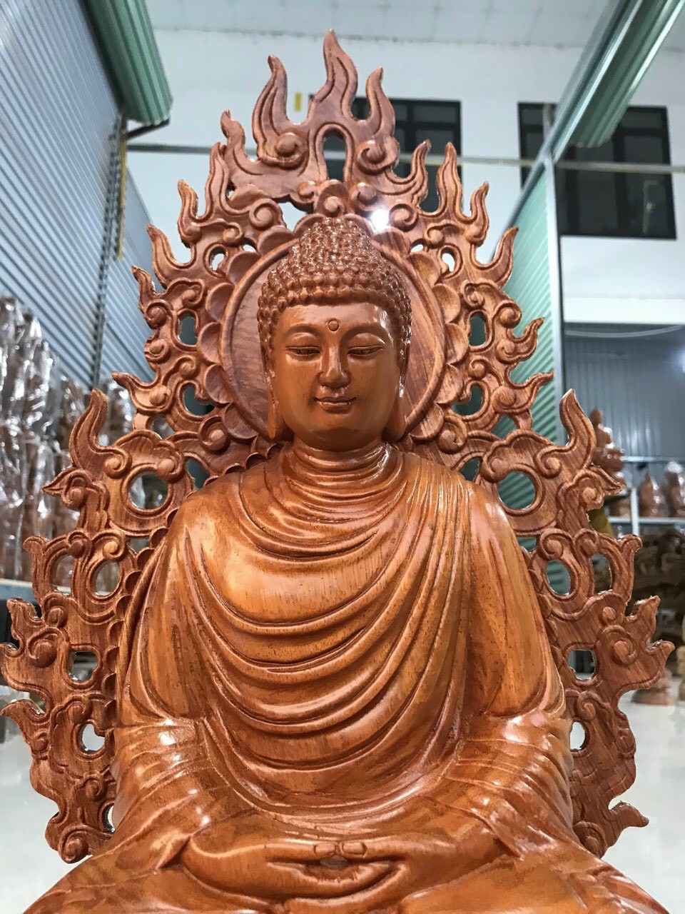 ✨Tượng phật thích ca bằng gỗ hương đá kt cao 40×20×20cm+ lá chắn hòa quang 50cm