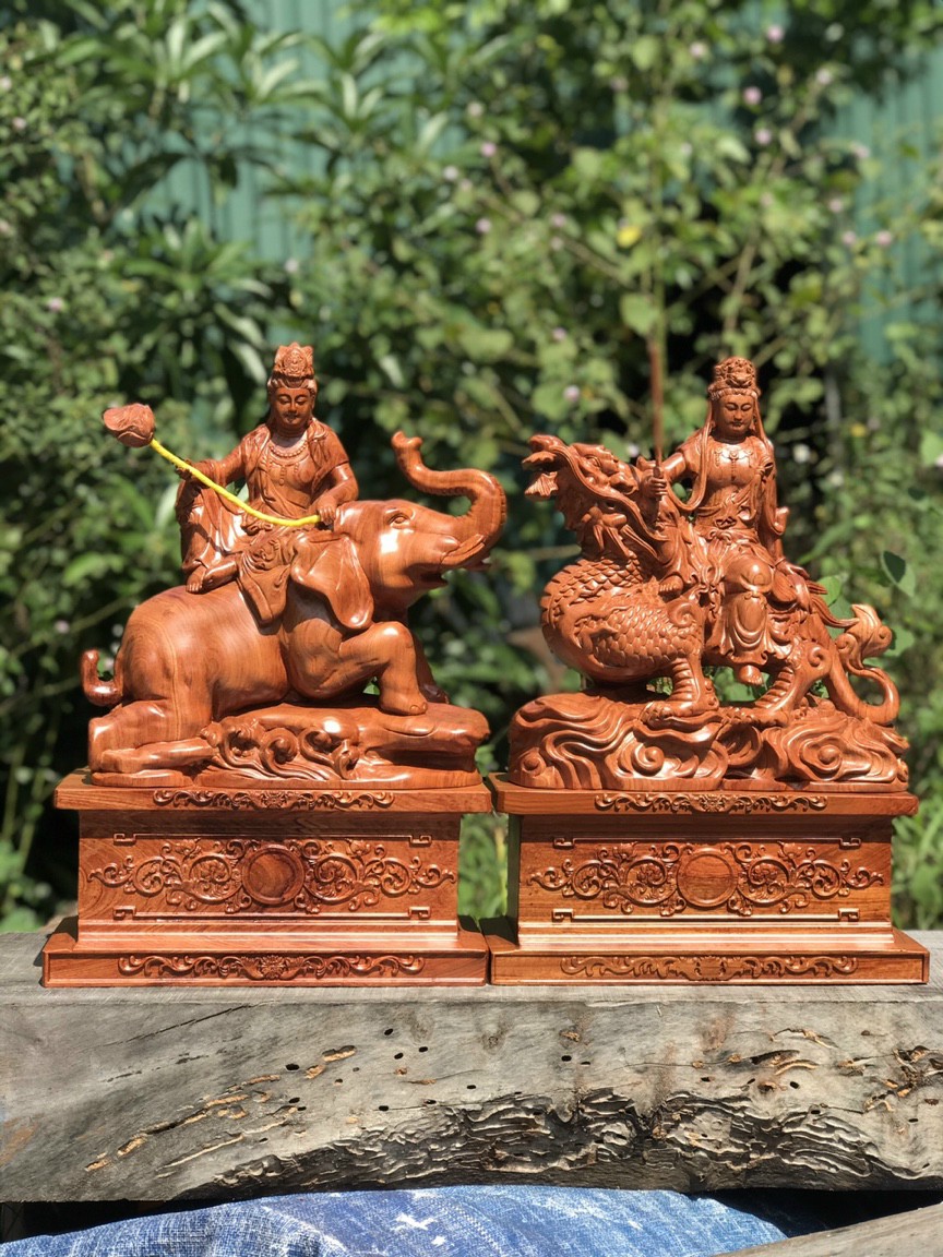 Cặp tượng Văn Thù và Phổ Hiền cưỡi linh thú cao 20 30cm gỗ hương cực đẹp