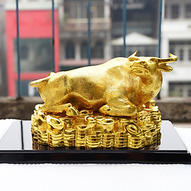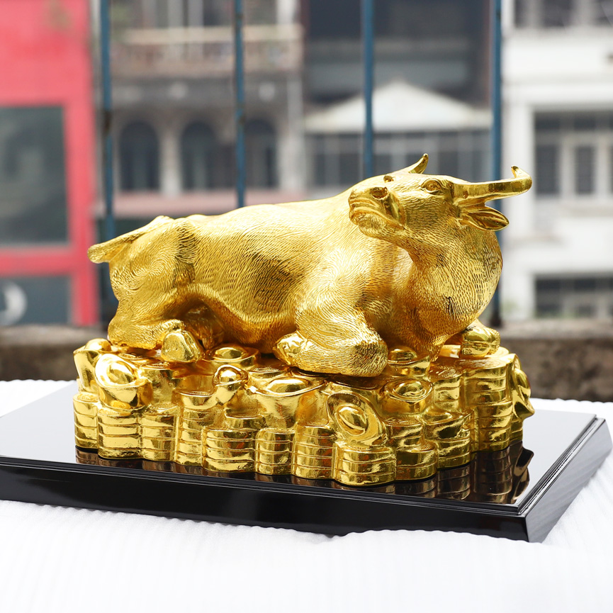 Đây cũng là linh vật đặc biệt trong bộ sưu tập tượng trâu mạ vàng. Tượng Trâu Tài Lộc được chế tác với kích thước lớn, đường nét hài hòa, tỉ mỉ và không kém phần tinh xảo. Sắc vàng lấp lánh càng giúp tượng trâu tài lộc thêm sang trọng, rất phù hợp để tặng sếp, đối tác, người làm ăn kinh doanh trong những dịp lễ lớn như Tết Tân Sửu sắp tới.