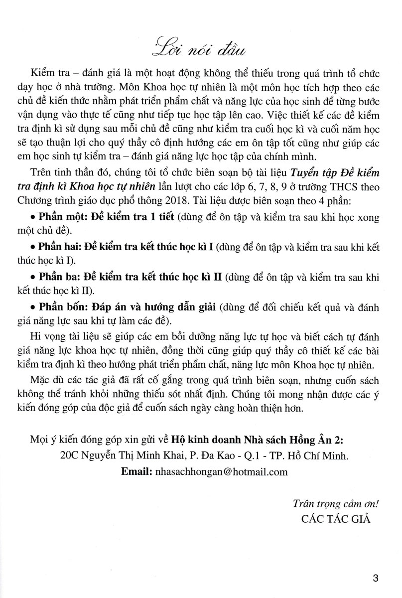 Trên tinh thần đó, chúng tôi tổ chức biên soạn bộ tài liệu Tuyển tập Đề kiểm tra định kì Khoa học tự nhiên lần lượt cho các lớp 6, 7, 8, 9 ở trường THCS theo Chương trình giáo dục phổ thông 2018. Tài liệu được biên soạn theo 4 phần: