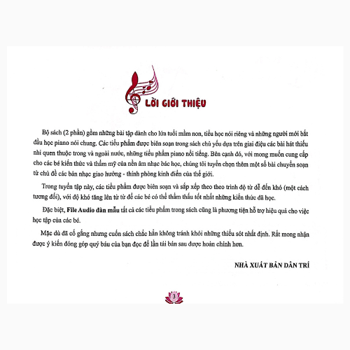 Bộ sách (2 phần) gồm những bài tập dành cho những lứa tuổi mầm non, tiểu học nói riêng và những người học mới piano nói chung. Các bài hát trong sách chủ yếu dựa