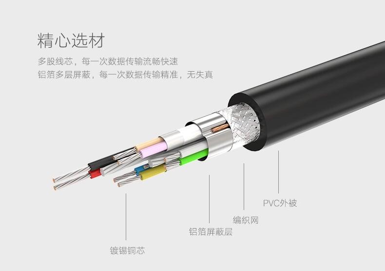 1. Corrosion-resistant tinned copper conductors provide effective conductivity; Aluminum foil and ground wire double shielding minimize data loss. 2. Molded strain relief and TPE jacket make the cable bend flexibly providing reliable performance in durable