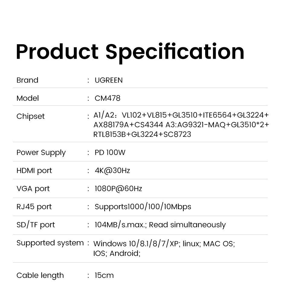1.Features: USB-C to HDMI, VGA, USB, SD/TF expansion hub, PD Charge, Lan 2.Input: USB Type-C 3.Output: HDMI 4K@30Hz, VGA 1080P, USB-A 3. x3, SD/TF, LAN 1Gbps, 4.HDMI resolution: 4K@30Hz 5.VGA resolution: 1080P 6. USB Speed: