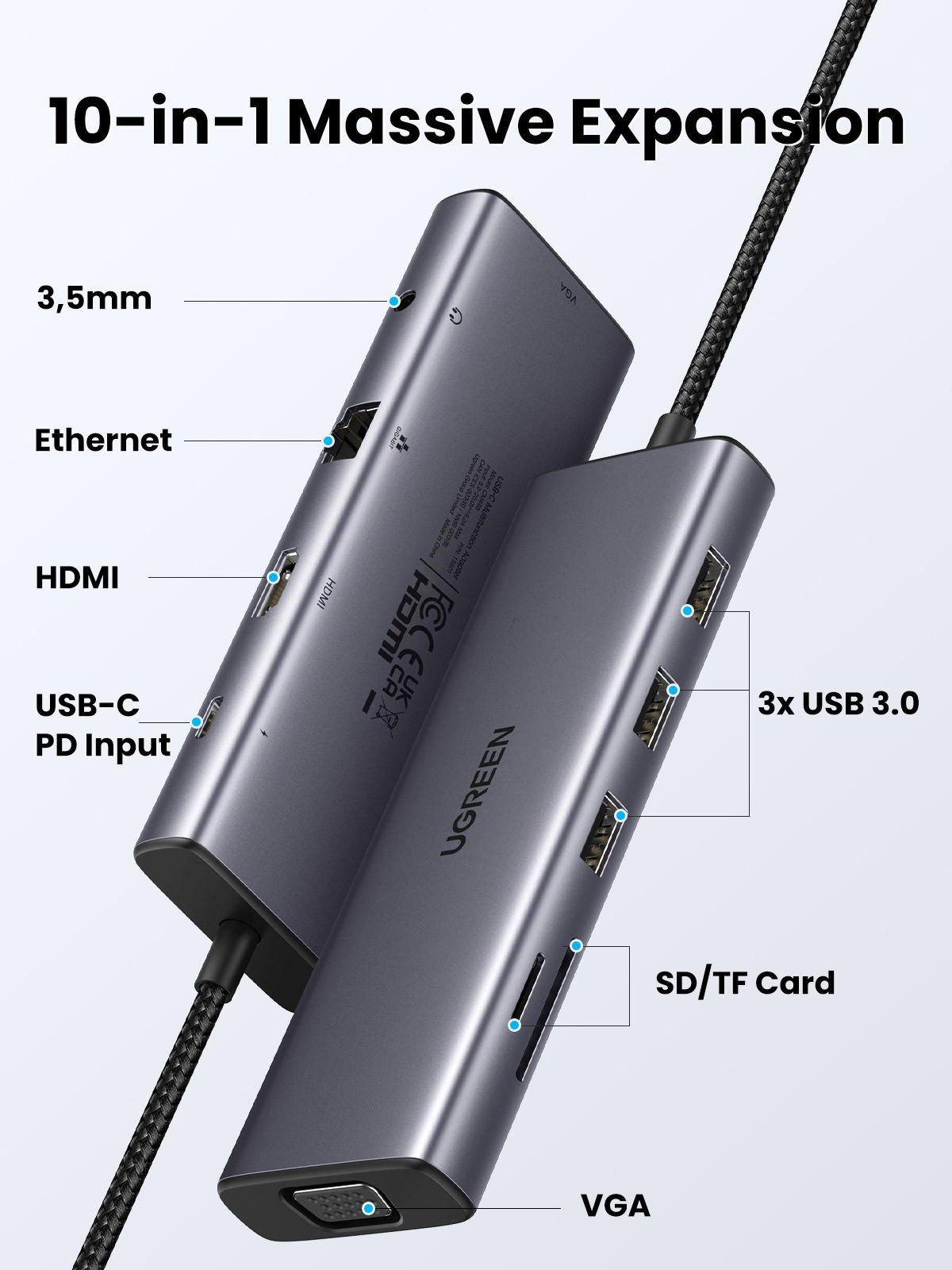 Ugreen 90325 USB type C to 1xusb A 10G + 1xusb-C 10G + 2xusb-A 5G + 2xHDMI 4K60Hz + DP + RJ45 Gigabit + SD/TF + 3.5mm Audio + PD Multifunction Docking Station MST for