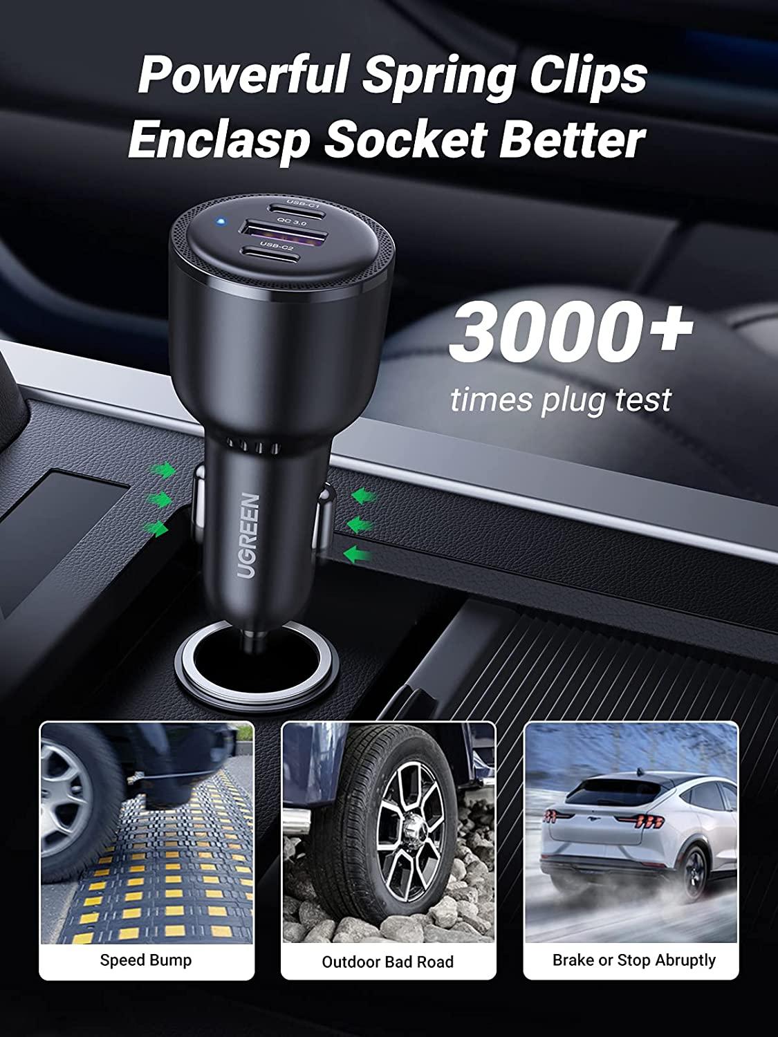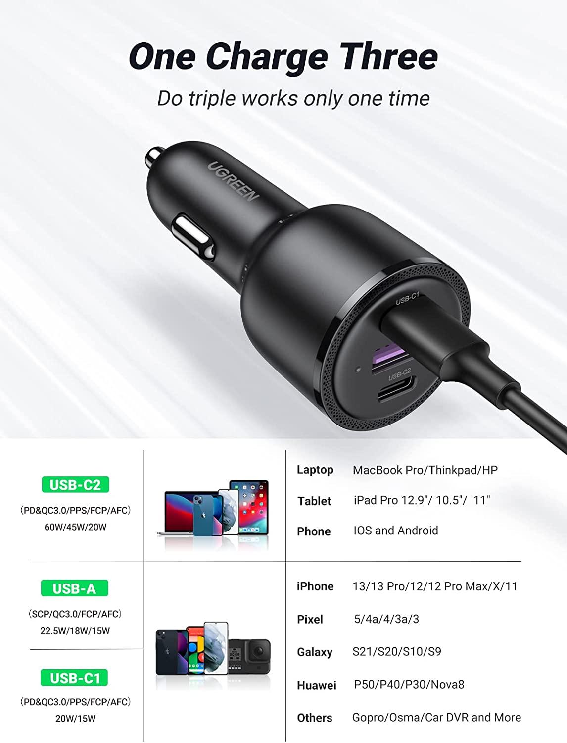 ✨Ugreen UG20467CD239TK 69w 2 cổng Type C + 1 usb A Bộ sạc nhanh 3 cổng điện thoại trên ô tô màu đen - HÀNG CHÍNH HÃNG
