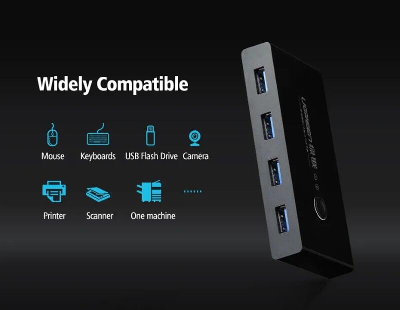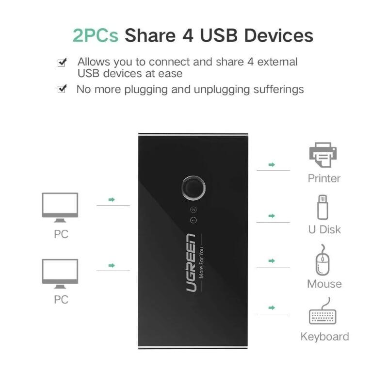 Ugreen 30768 2 in 4 out usb2.0 sharing switch box usb 3.0 us216 1. Two computer can use 4 same USB device simultaneously 2. USB 3.0 3. 280g 4. 25 x 15 x 5 cm