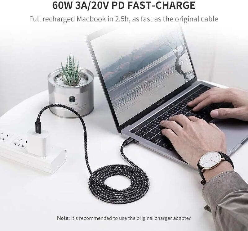 1. The USB C to USB C Power Cable delivers max 60W(20V/3A) fast charging to Type C/Thunderbolt 3 laptops/tablets/phones, when paired with 96W/87W/65W/45W/18W USB Power Delivery charger. Fully recharge MacBook Air 13" in 1.5h, as