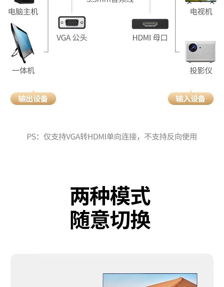 1. Input: VGA Male 2. Output: HDMI Female 3. Audio input: 3.5mm stereo port,Sampling rate up to 24bit 32kHz/44.1kHz/ 48kHz 4. Power supply: USB-C 5V/1A 5. Support resolution up to 1080P@60Hz *When the resolution is