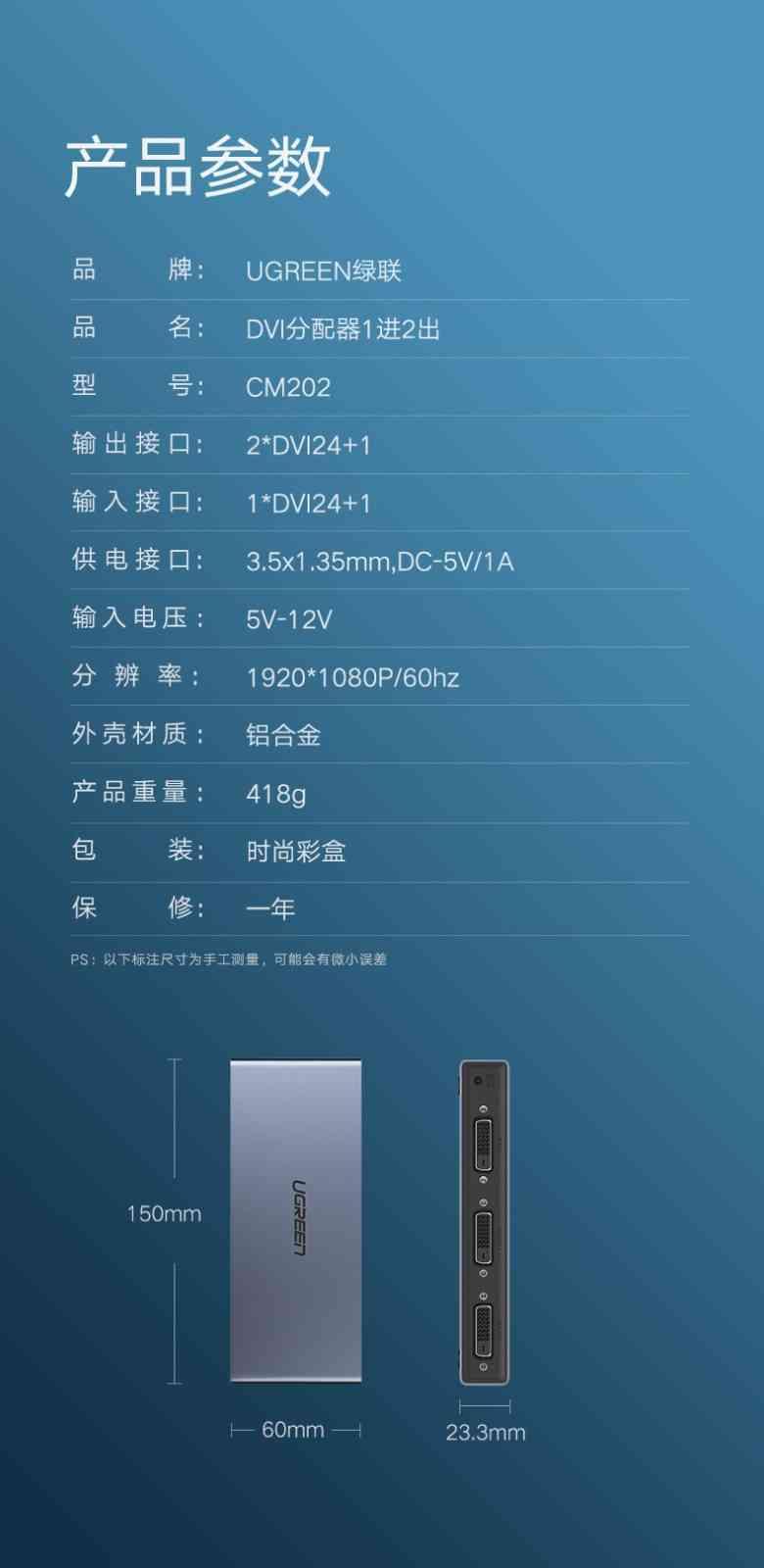 1. Brand: UGREEN 2. Code: 80647 - CM202 3. Color: Gray 4. Input: DVI 5. Output: 2 DVI 6. Standard: DVI-D [DVI Digital] 7. Power: 5V 8. Contact Material : Nickel 9. Housing Material :