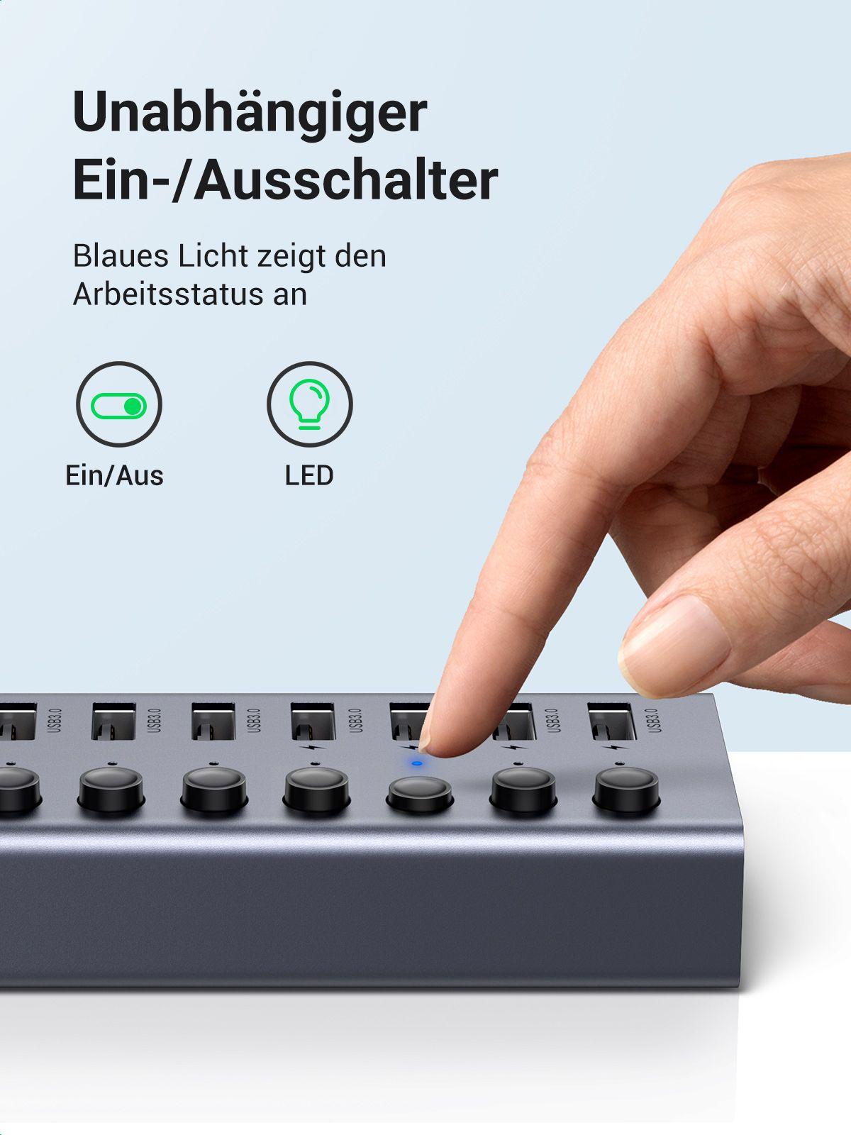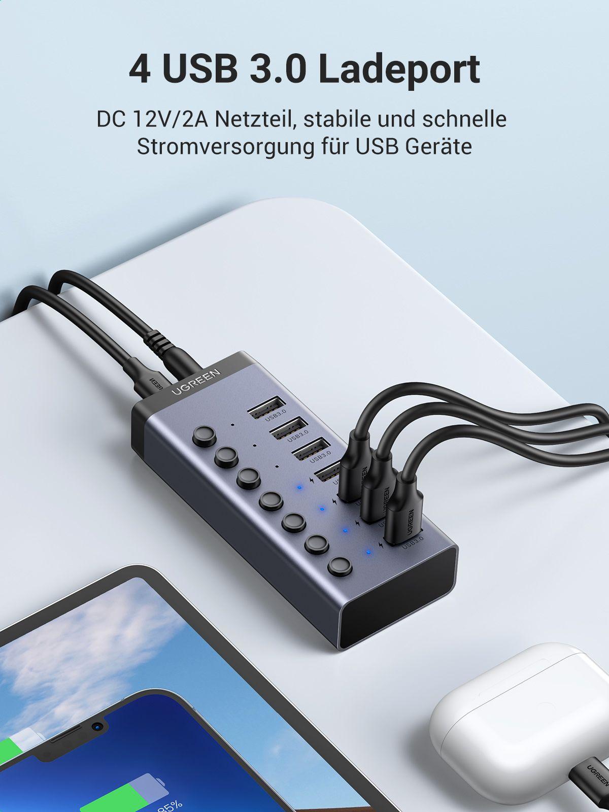 ✨Ugreen UG90307CM481TK hub ra 7 cổng USB 3.0 + Adapter 12v-2A có hỗ trợ truyền dữ liệu và sạc có kèm dây USB type C chuẩn cắm EU chân tròn Bộ chia Màu Xám - HÀNG CHÍNH HÃNG