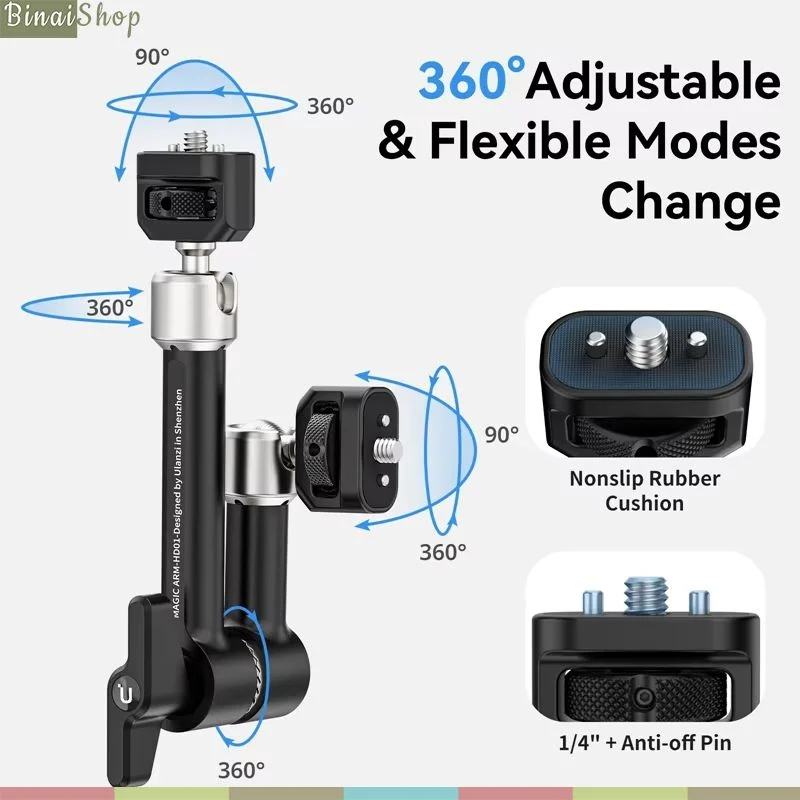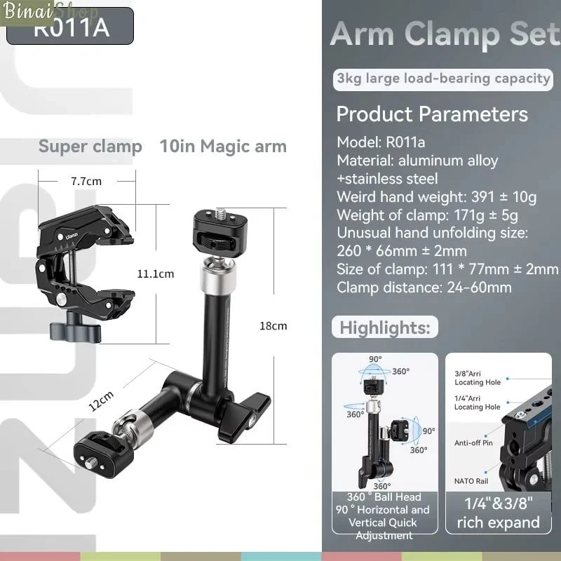- Ulanzi R011A thiết kế nhỏ gọn, chắc chắn, độ bền cao, khả năng chịu tải lớn, hỗ trợ mở rộng 10 inch, ren 1/4 và xoay linh hoạt 360 độ, kẹp càng cua bám tốt