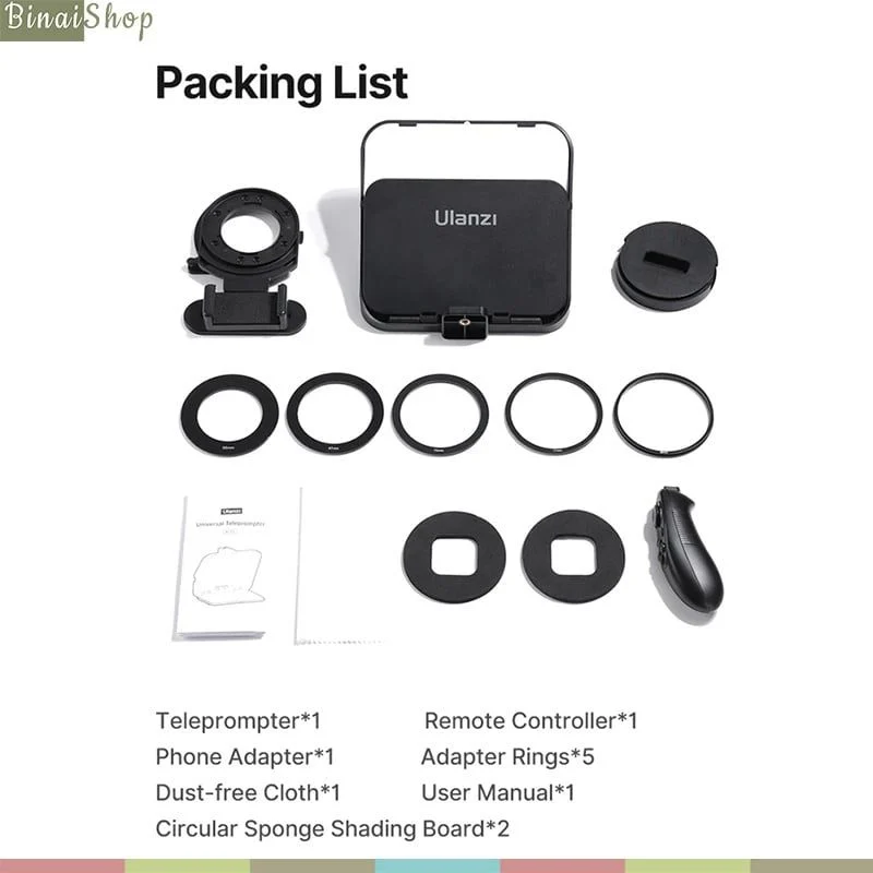 - 01 Sách hướng dẫn THÔNG SỐ KỸ THUẬT Model RT02 Material ABS, PC, Glass and Rubber Compatible Devices Phone/Camera/Laptop Teleprompter Size 18.8x17.8x10.3 cm Teleprompter Net Weight 465.5g Supported Prompting Area 19 x 12cm Phone Adapter Size 15.3 x 10.8 x 3.1cm Phone Adapter Net Weight 80.3g Phone Clamp Range 55mm-80mma Gross Weight 910g±5g Package Size 30 x 20.3 x 12.3 cm Keyword: Ulanzi Teleprompter RT02, Teleprompter RT02, Ulanzi RT02, RT02, máy nhắc chữ mini, máy nhắc chữ giá rẻ, máy nhắc chữ là gì, máy nhắc chữ hà nội, máy nhắc chữ biên tập viên, máy nhắc chữ điện thọai, máy nhắc chữ cho máy ảnh, máy nhắc chữ cho máy tính, máy nhắc chữ cho máy tính bảng.