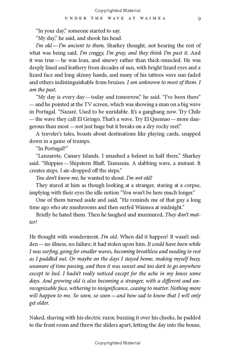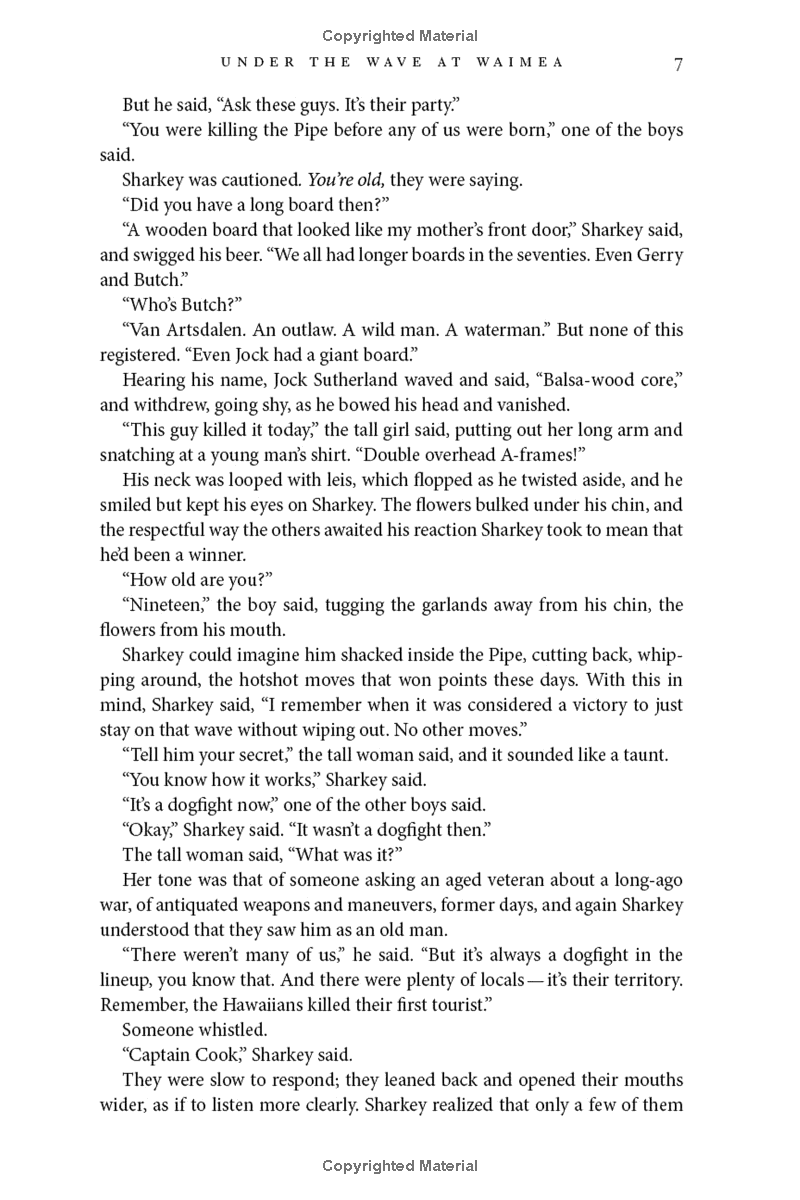Now in his sixties, big-wave surfer Joe Sharkey has passed his prime and is losing his “stoke.” The younger surfers around the breaks on the north shore of Oahu still idolize the Shark, but his sponsors are looking elsewhere. One night, while driving home from a bar after one too many, Joe accidentally kills a stranger near Waimea, a tragedy that sends his life out of control. As the repercussions of the accident spiral ever wider, Joe’s devoted girlfriend Olive throws herself into uncovering the dead man’s identity and helping Joe find vitality and refuge in the waves again.