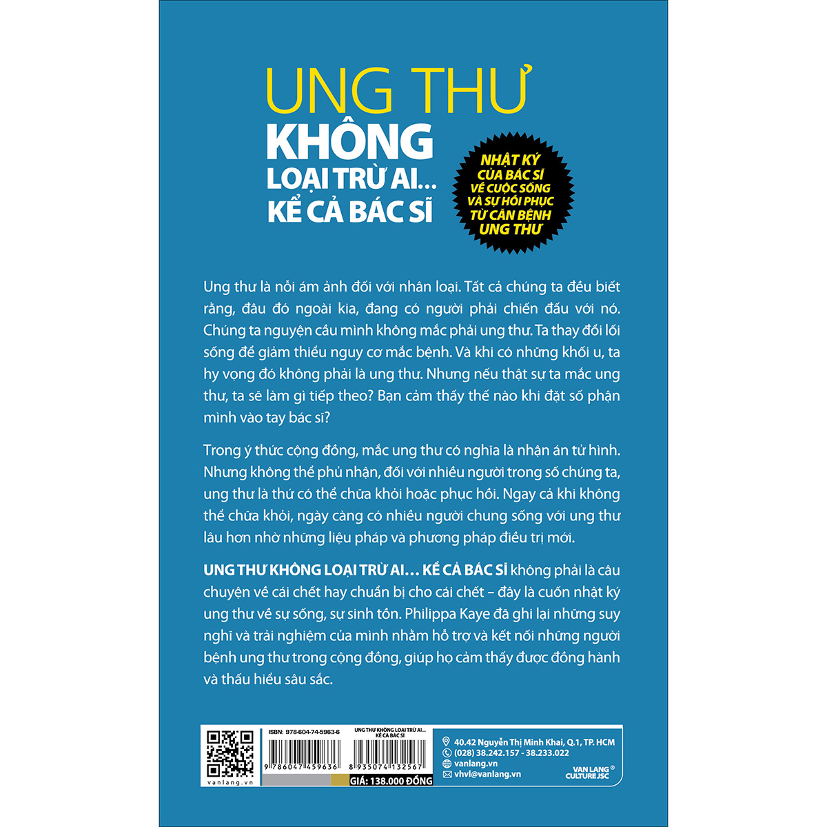 UNG THƯ KHÔNG LOẠI TRỪ AI… KỂ CẢ BÁC SĨ không phải là câu chuyện về cái chết hay chuẩn bị cho cái chết - đây là cuốn nhật ký ung thư về sự sống, sự sinh tồn. Philippa Kaye đã ghi lại những suy nghĩ và trải nghiệm của mình nhằm hỗ trợ và kết nối những người bệnh ung thư trong cộng đồng, giúp họ cảm thấy được đồng hành và thấu hiểu sâu sắc.