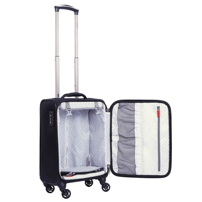 FEATURES - Vertical opening front panel with dedicated 15.6" laptop compartment (cabin size only) - Expandability for increased capacity - Rich, sophisticated interior organization with multiple compartments and pockets - 360-degree rotating double wheel system