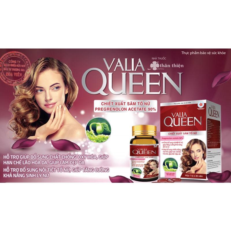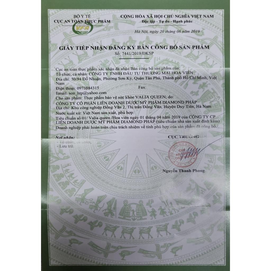 Valia Queen được kết hợp từ những thành phần thiên nhiên lành tính, cấp phép bởi Bộ Y Tế – Cục ATTP với công dụng giúp hỗ trợ bổ sung nội tiết tố nữ giúp tăng cường khả năng sinh lý nữ, hỗ trợ hạn chế lão hóa da, giảm nám, tàn nhang, giúp làm đẹp da Nếu chị em phụ nữ bị suy giảm nội tiết tố nữ, tiền mãn kinh, mãn kinh hoặc bị nám da, tàn nhang, lão hóa da,…mà chưa biết sử dụng sản phẩm nào để cải thiện. Thì Valia Queen là sản phẩm mà quý vị có thể tham khảo để sử dụng Valia Queen là gì Valia Queen là thực phẩm bảo vệ sức khỏe, thuộc nhóm hỗ trợ sinh lý – nội tiết tố, được kết hợp từ những thành phần lành tính như là: mầm đậu nành, sâm tố nữ, collagen tuýp II, bạch quả,…Sản phẩm được bào chế dưới dạng viên nang mềm, sử dụng bằng cách uống trực tiếp với nước, thích hợp dùng cho phụ nữ. Công dụng của Valia Queen Theo giấy xác nhận nội dung quảng cáo số 01244/2019/ATTP-XNQC thì sản phẩm Valia Queencó công dụng giúp hỗ trợ bổ sung nội tiết tố nữ, giúp tăng cường khả năng sinh lý nữ. Hỗ trợ giúp bổ sung chất chống oxy hóa, giúp hạn chế lão hóa da và giảm nám, tàn nhang, hỗ trợ làm đẹp da Đối tượng sử dụng Valia Queen Sản phẩm Valia Queen thích hợp sử dụng cho những đối tượng như: ● Người bị nám, tàn nhang. ● Người bi lão hóa da. ● Người cần chăm sóc làm đẹp da Hướng dẫn sử dụng Valia Queen ● Mỗi ngày sẽ uống 1 lần 2 viên. ● Uống trước bữa ăn 30 phút hoặc sau khi ăn 1 giờ. Lưu ý: không sử dụng cho người mẫn cảm với bất kỳ thành phần nào của sản phẩm. Thành phần của Valia Queen Trong mỗi 1 viên có chứa những thành phần chính như là: Chiết Xuất Mầm Đậu Nành 80% 250mg Chiết Xuất Sâm Tố Nữ100mg Collagen Tuýp I Và II 60mg Cao Bạch Quả20mg Pregnenolon Acetate 90% 20mg Thành phần khác: Tên thành phần Hàm lượng Kẽm gluconat 20mg L-glutathione 90% 10mg Phụ liệu: Gelatin, Sorbitol, Glycerin, Sáp ong, Dầu cọ, Dầu đậu nành, Lecithin, Elthyl vanilin, màu tổng hợp vừa đủ Chất lượng của sản phẩm Valia Queen Valia Queen được sản xuất bởi nhà máy đạt chuẩn GMP cùng dây chuyền sản xuất hiện đại, tiên tiến đảm bảo vệ sinh an toàn thực phẩm. Sản xuất đạt yêu cầu an toàn thực phẩm theo tiêu chuẩn số 01/ Valia queen /Hoa viên ngày 01 tháng 04 năm 2019 của CÔNG TY CP LIÊN DOANH DƯỢC MỸ PHẨM DIAMOND PHÁP. Ngoài ra còn được Bộ Y Tế – Cục ATTP cấp phép lưu hành trên toàn quốc theo số đăng ký 7441/2019/ĐKSP. Lưu ý