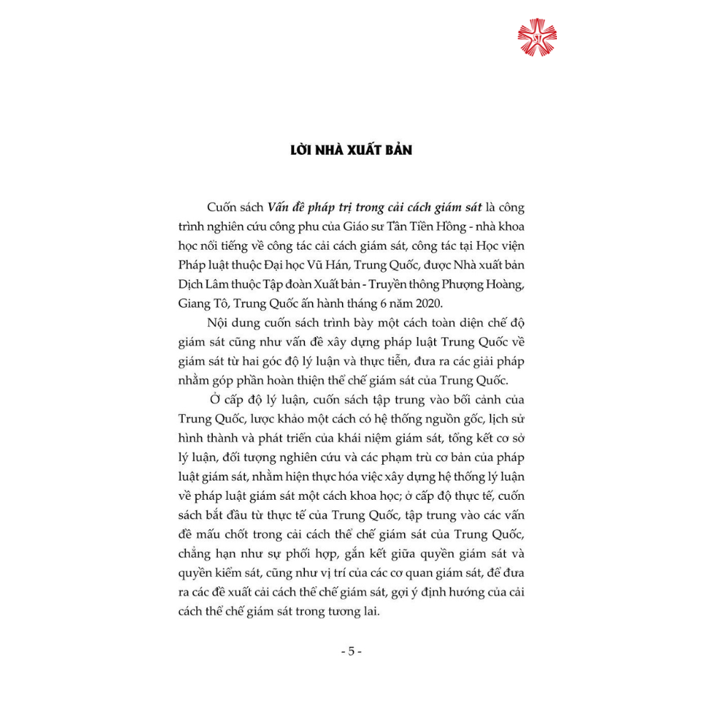 Cuốn sách được kết cấu gồm 5 phần, trình bày một cách toàn diện chế độ giám sát cũng như vấn đề xây dựng pháp luật Trung Quốc về giám sát từ hai góc độ lý luận và thực tiễn, đưa ra các giải pháp nhằm góp phần hoàn thiện thể chế giám sát của Trung Quốc. Đây là cuốn sách chuyên khảo có bố cục lôgích hoàn chỉnh và bối cảnh rõ ràng về cải cách thể chế giám sát của Trung Quốc, là tài liệu tham khảo bổ ích đối với các nhà nghiên cứu chuyên ngành luật cũng như đông đảo bạn đọc quan tâm đến chủ đề này.