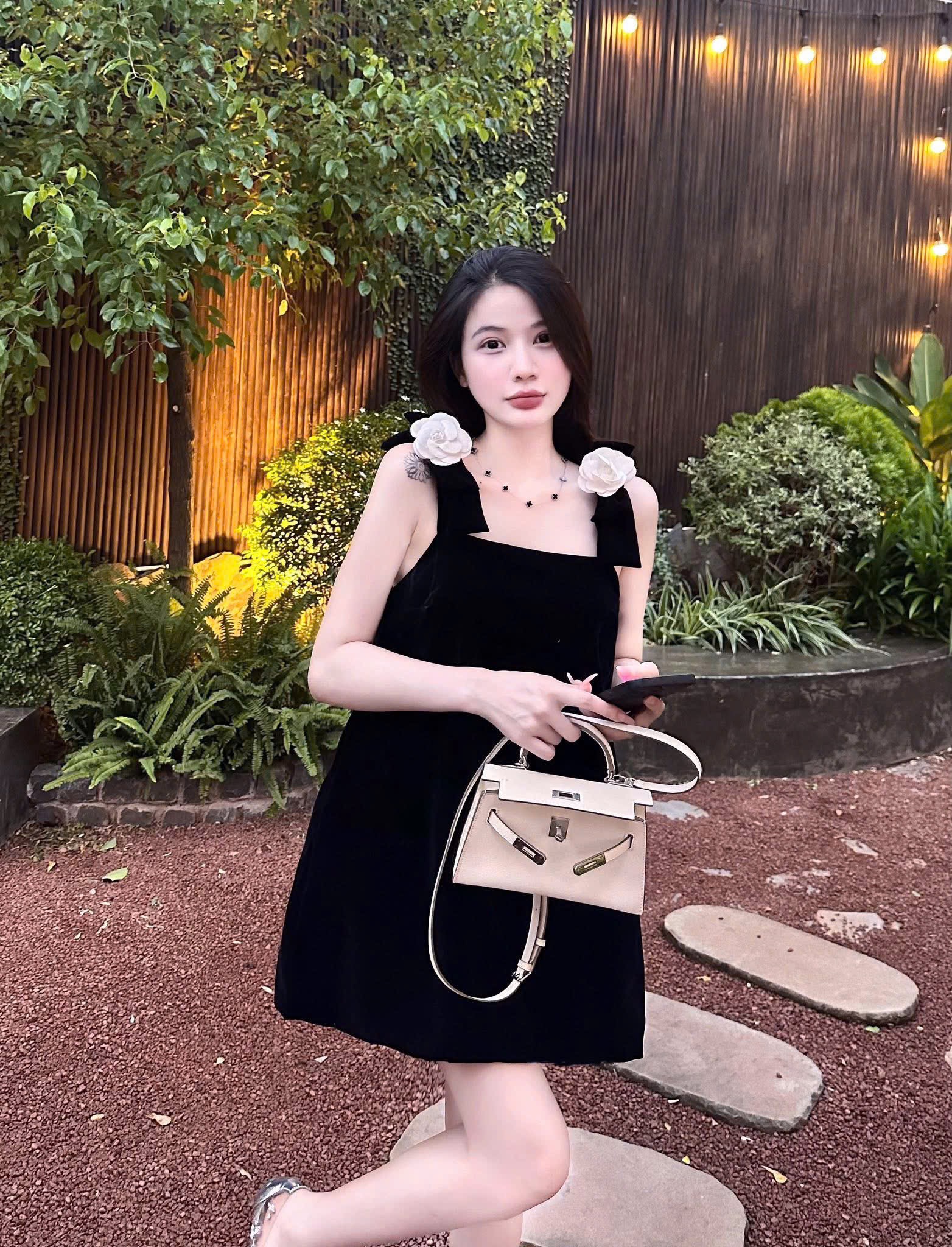 Thiết kế nổi bật: Váy nhung hai dây, quai nơ dễ thương, dáng suông thoải mái, che khuyết điểm tốt. Điểm nhấn hoa trà tinh tế, mang lại vẻ ngoài nữ tính và sang trọng.