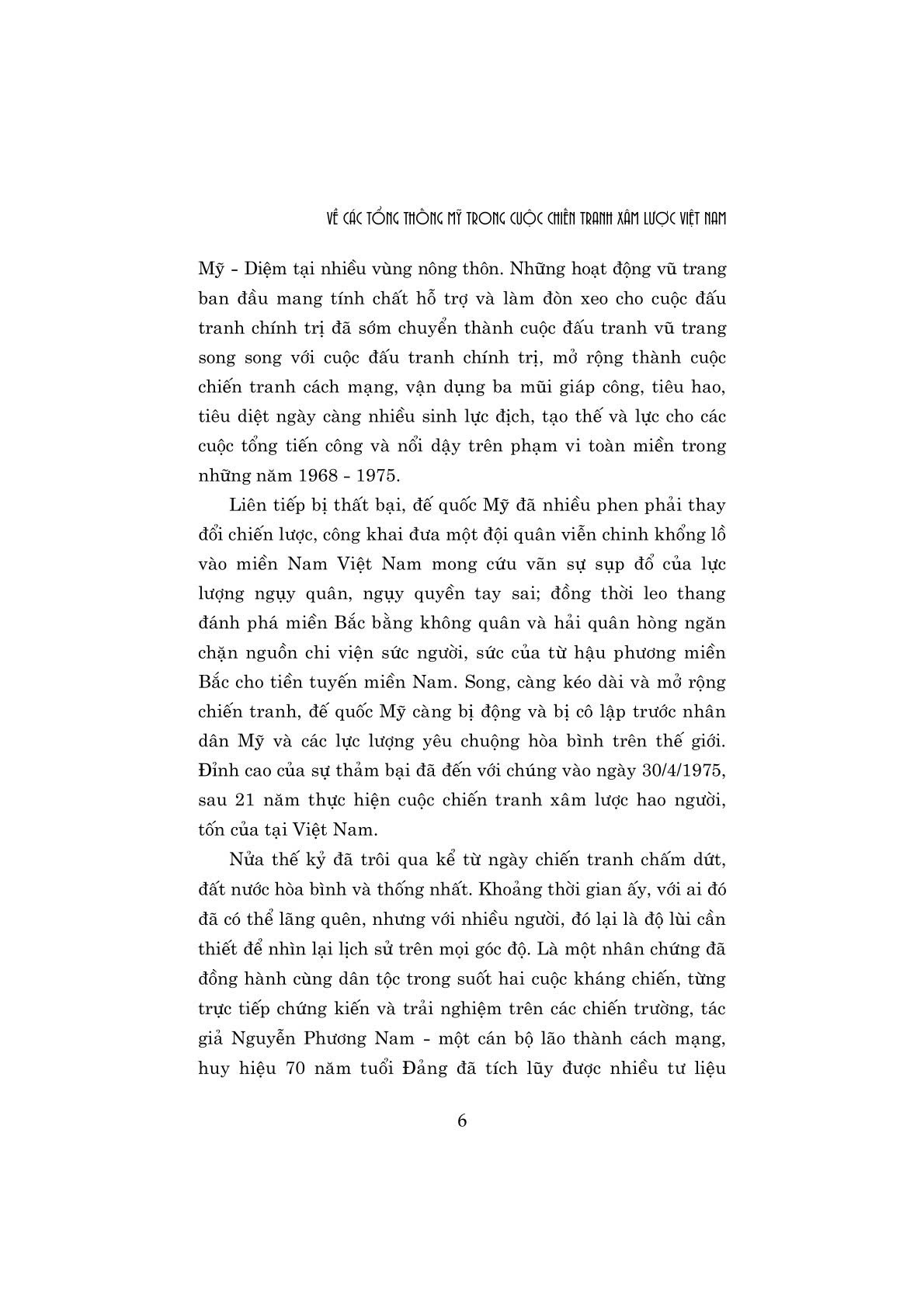 Cuốn sách Về các tổng thống Mỹ trong chiến tranh xâm lược Việt Nam của tác giả Nguyễn Phương Nam - cán bộ lão thành cách mạng 70 năm tuổi Đảng, vốn là một người lính đã kinh qua hai cuộc chiến tranh lớn của đất nước: chống thực dân Pháp và đế quốc Mỹ xâm lược. Bạn đọc khi lật giở từng trang sách sẽ nhận ra ông vừa là nhân chứng của lịch sử, phân tích, nhìn nhận khách quan nhất về nhiều sự kiện, nhiều nhân vật diễn ra trong hơn 20 năm chiến tranh chống đế quốc Mỹ ở Việt Nam.