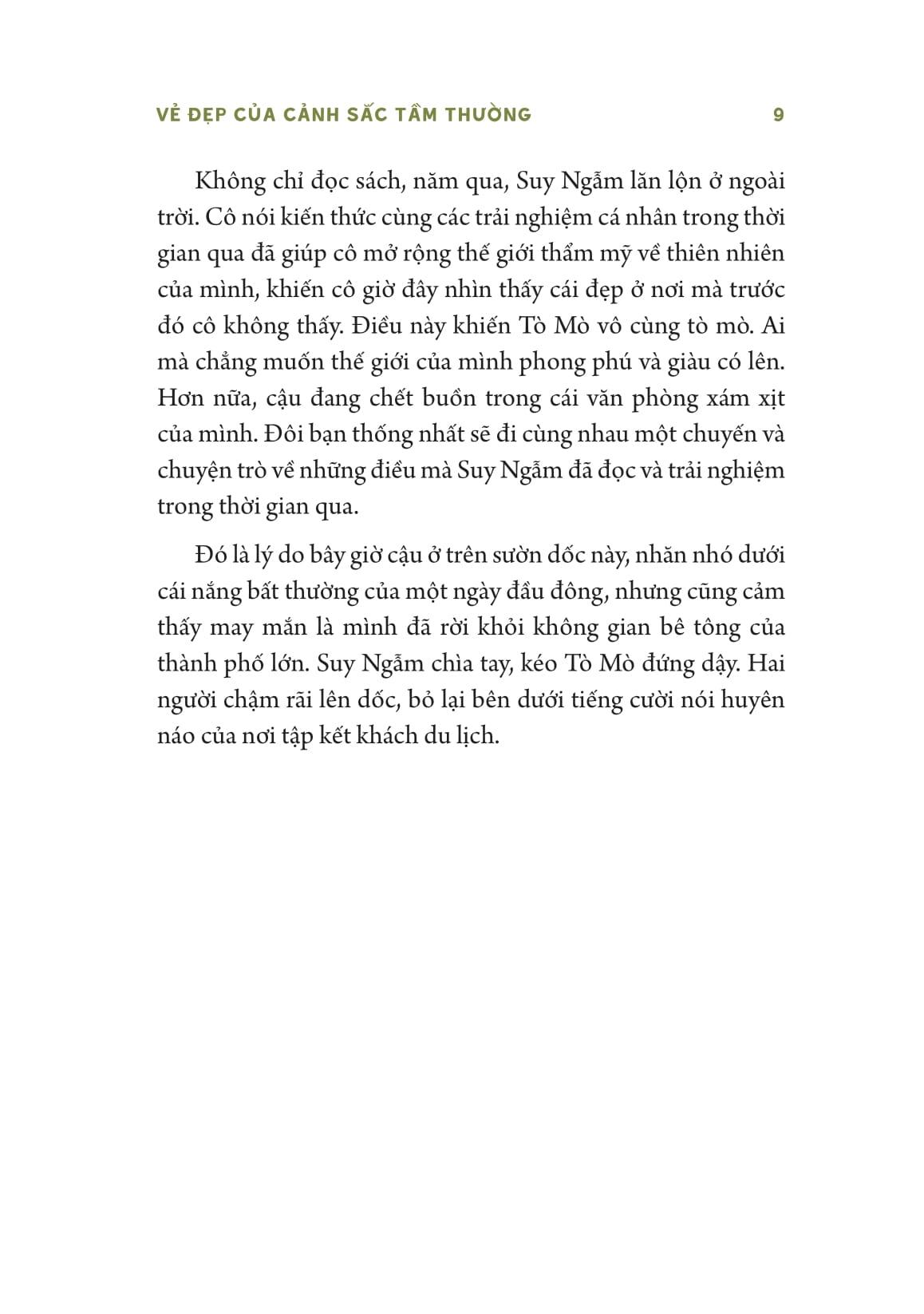 Cuốn sách “Vẻ đẹp của cảnh sắc tầm thường” mở ra những con đường mới để mỗi người có thể phát triển khả năng rung động và kết nối sâu sắc với mọi hình thái của thiên nhiên, thay vì chỉ với những phong cảnh hợp ram. Hành trình của Tò Mò và Suy Ngẫm cũng giúp ta đi xuyên qua vẻ bề ngoài để cảm nhận được vẻ đẹp của sự phong phú, phức tạp và bí ẩn của âm thanh và mùi vị; của chuồn chuồn, nhện và bướm di cư; của đầm lầy, hoa tàn và lúc xấu trời - những điều mà trước kia ta coi là bình thường, thậm chí tầm thường, xấu xí.