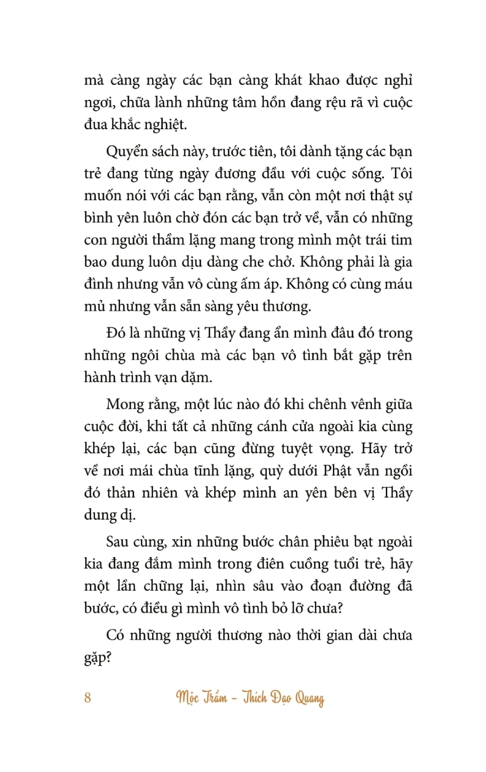 Tác giả muốn nói với các bạn rằng, vẫn còn một nơi thật sự bình yên luôn chờ đón các bạn trở về, vẫn có những con người thầm lặng mang trong mình một trái tim bao dung luôn dịu dàng che chở. Có thể là gia đình, người thân có thể bạn bè, và cũng có thể là những vị Thầy đang ẩn mình đâu đó trong những ngôi chùa mà các bạn vô tình bắt gặp trên hành trình vạn dặm.