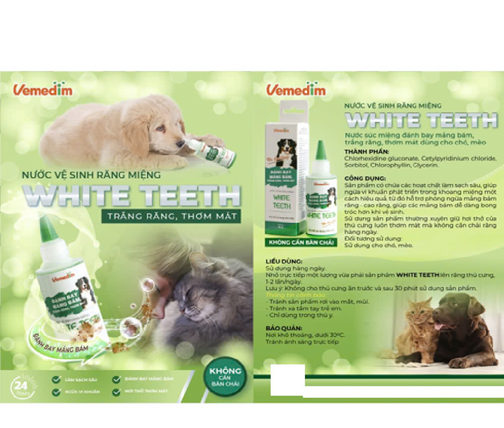 Vemedim WHITE TEETH Nước súc miệng đánh bay mảng bám, trắng răng, thơm mát dùng cho chó, mèo, chai 100ml Thành phần: Chlorhexidine gluconate, Cetylpyridinium chloride, Sorbitol, Chlorophyllin, Glycerin. Công dụng: Sản phẩm có chứa các hoạt chất làm sạch sâu, giúp ngừa vi khuẩn phát triển trong khoang miệng một cách hiệu quả, từ đó hỗ trợ phòng ngừa mảng bám răng - cao răng, giúp các mảng bám dễ dàng bong tróc hơn khi vệ sinh. Sử dụng sản phẩm thường xuyên giữ hơi thở của thú cưng luôn thơm mát mà không cần chải răng hàng ngày. Đối tượng sử dụng: Sử dụng cho chó, mèo. Hướng dẫn sử dụng: Sử dụng hàng ngày. Nhỏ trực tiếp một lượng vừa phải sản phẩm WHITE TEETH lên răng thú cưng, 1-2 lần/ngày. Lưu ý: Không cho thú cưng ăn trước và sau 30 phút sử dụng sản phẩm. Thông tin cảnh báo: