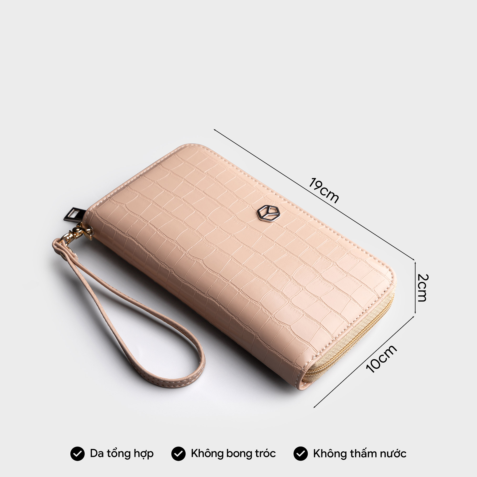 Kích thước: Chiều cao 13.0cm x Chiều ngang 21.0cm x Chiều rộng 4.0cm Ví cầm tay có dây đeo tay tháo rời được Có hai vách ngăn đựng thẻ và điện thoại Dây khóa kéo