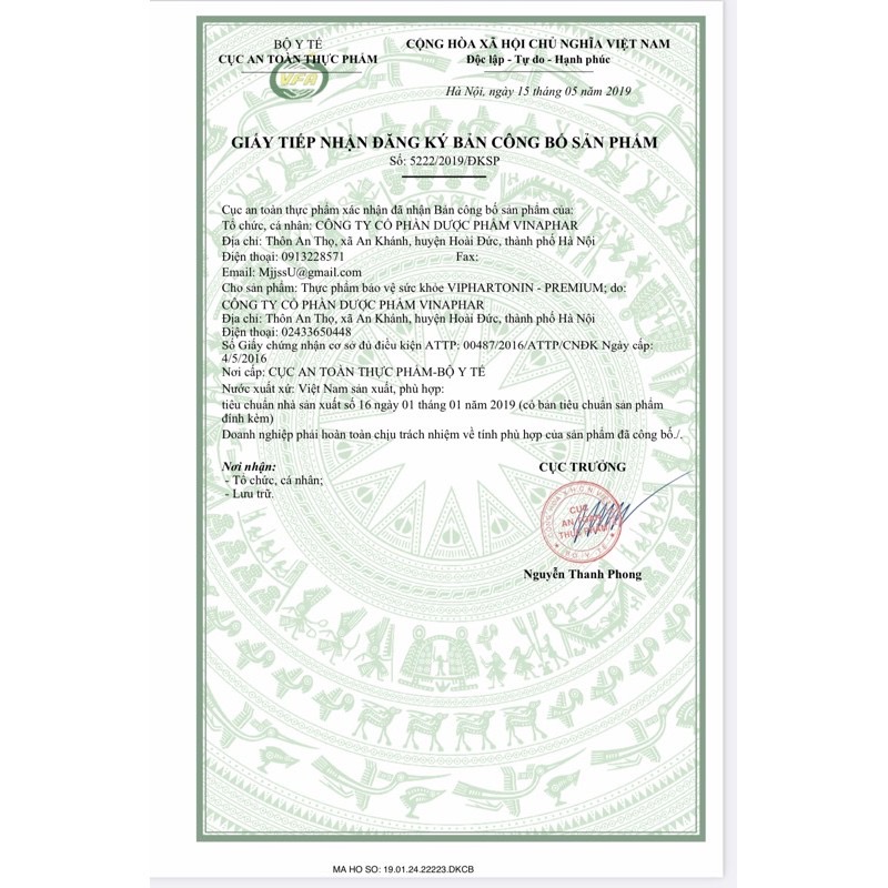- Cảnh báo về sức khỏe Chú ý: Thực phẩm này không phải là thuốc, không có tác dụng thay thế thuốc chữa bệnh. Không sử dụng cho người mẫn cảm với bất kỳ thành phần nào của sản phẩm. Không dùng cho người đang mắc các bệnh chảy máu ( máu chậm đông), phụ nữ đang kỳ kinh nguyệt, người chuẩn bị phẫu thuật, người cao huyết áp, trẻ dưới 12 tuổi, người đang bị xuất huyết, người đang dùng các thuốc chống đông máu. * LƯU Ý : Bảo quản : Nơi khô ráo, thoáng mát, tránh ánh sáng. **XUẤT XỨ VÀ THƯƠNG NHÂN CHỊU TRÁCH NHIỆM VỀ CHẤT LƯỢNG HÀNG HÓA CÔNG TY CP DƯỢC PHẨM VINAPHAR ĐỊA CHỈ : AN THỌ - AN KHÁNH - HÀ NỘI