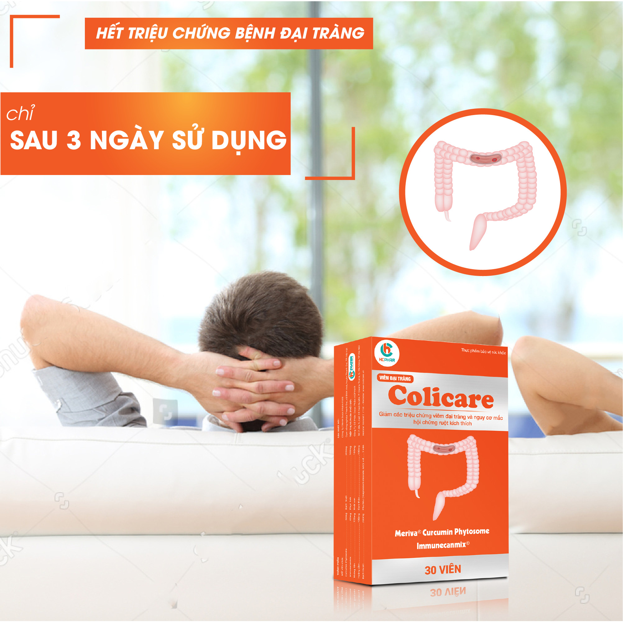 - Hỗ trợ miễn dịch đường tiêu hoá, giúp tái tạo vết loét và phục hồi niêm mạc đại tràng. ★ ƯU ĐIỂM CỦA VIÊN ĐẠI TRÀNG COLICARE - TÁC DỤNG NHANH: Bài thuốc cổ truyền là công thức kết hợp các nguyên liệu theo nghiên cứu và kinh nghiệm của y học dân tộc một cách khoa học. Chỉ cần sau 3 ngày sử dụng các triệu chứng của viêm đại tràng hầu như sẽ không còn dấu hiệu tồn tại! - VƯỢT TRỘI: Với công nghệ hiện đại giúp phát huy tối đa tác dụng của nguyên liệu. Curcumin Phytosome vượt trội về khả năng hấp thu, phát huy tác dụng tốt nhất so với các nguyên liệu Curcumin hiện có. - HIỆU QUẢ LÂU DÀI: Với sự bổ sung các thành phần vừa bổ dưỡng vừa tăng cường miễn dịch cho cơ thể. Immunecanmix kích thích các tế bào miễn dịch hoạt động, bổ sung dưỡng chất tế bào biểu mô và cung cấp thức ăn cho vi khuẩn có lợi đường ruột - AN TOÀN: Sản phẩm có nguồn gốc 100% tự nhiên. ★ ĐỐI TƯỢNG SỬ DỤNG