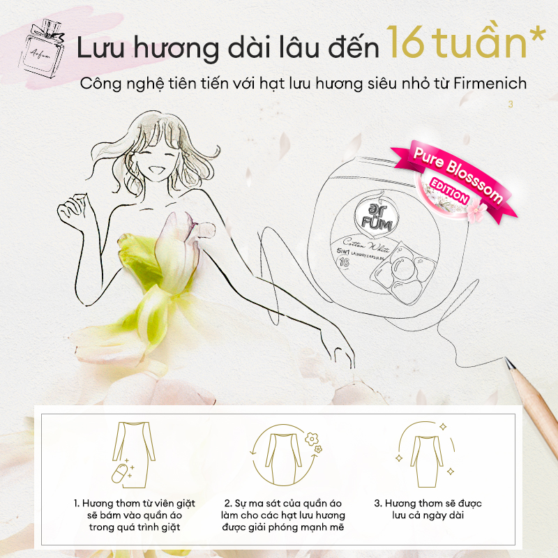 - Với công nghệ tiên tiến với hạt lưu hương siêu nhỏ từ Firmenich giúp lưu hương lâu tới 16 tuần.