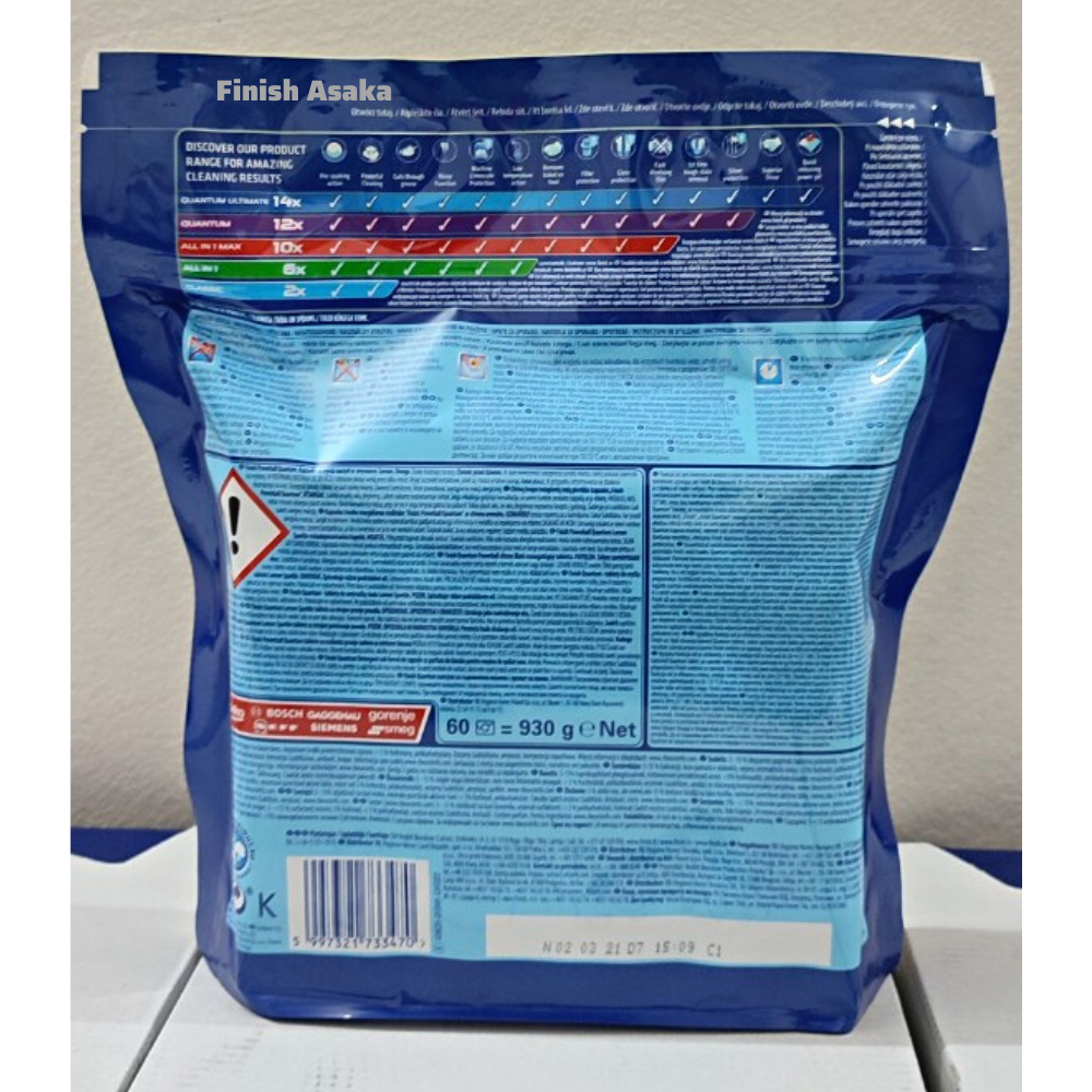 Túi 60 viên rửa chén Finish Quantum Max Dishwasher Tablets (là viên rửa chén cao cấp chuyên dùng cho máy rửa chén)
