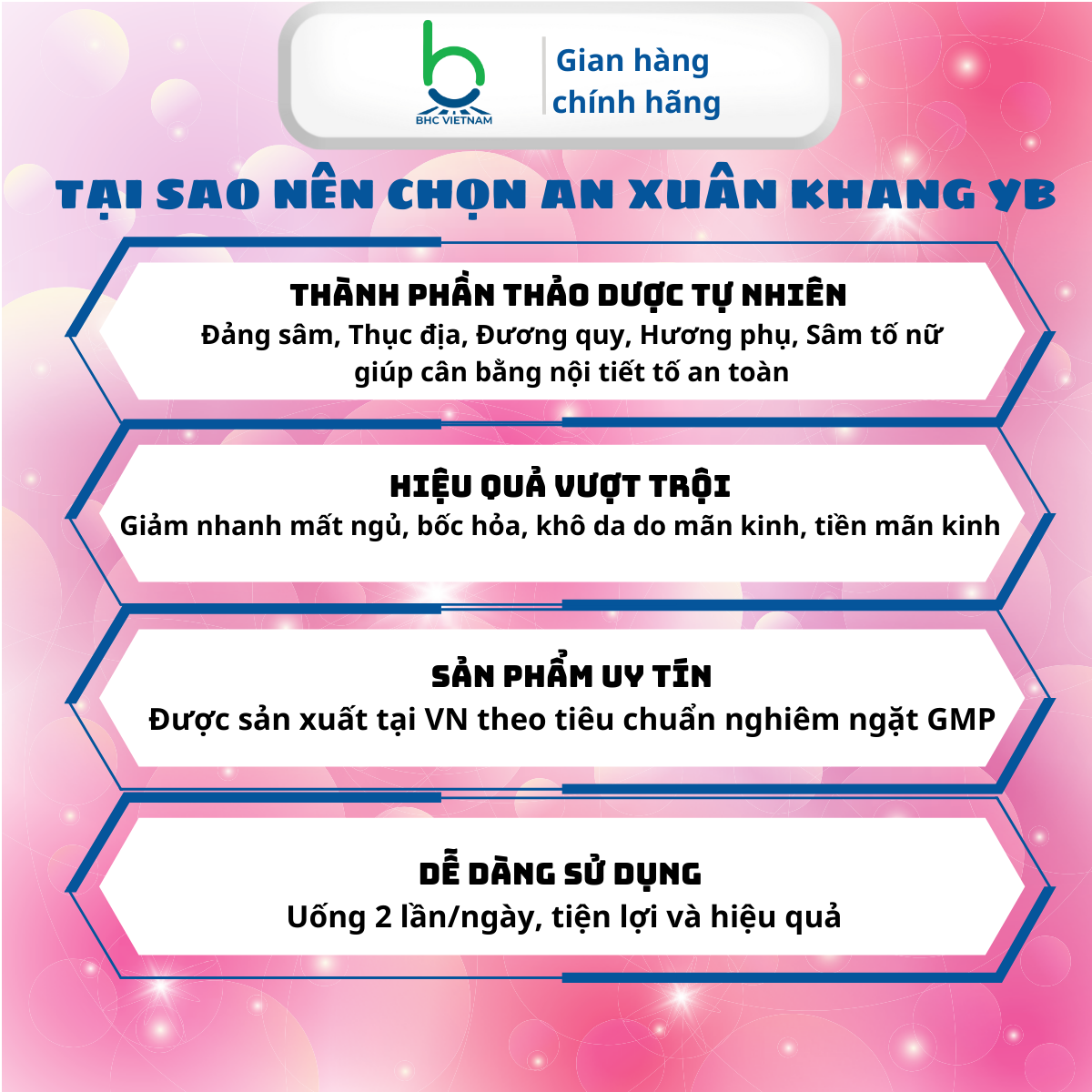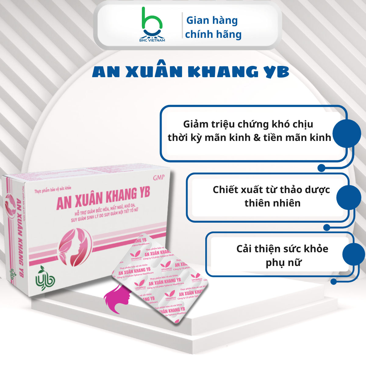 Lựa chọn AN XUÂN KHANG YB để giảm bớt các triệu chứng khó chịu của thời kỳ mãn kinh và cải thiện chất lượng cuộc sống. Đặt hàng ngay hôm nay để được giao hàng tận nơi nhanh chóng!
