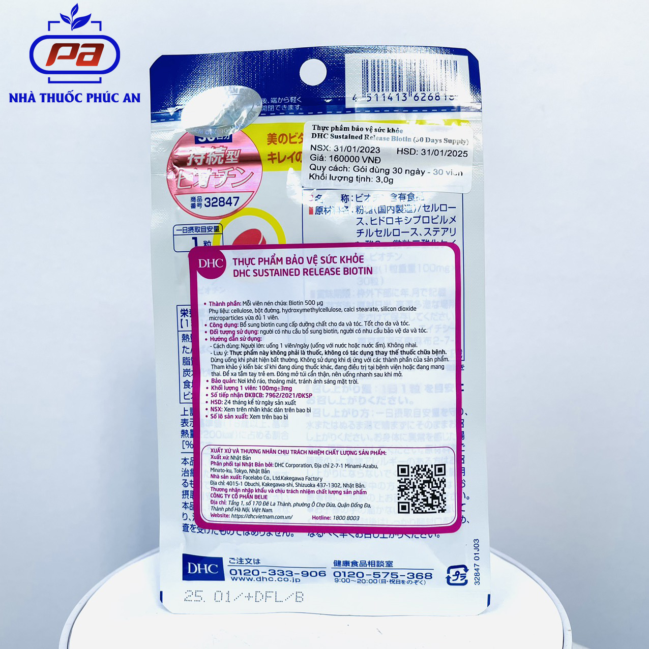 - Viên uống bổ sung biotin của DHC sử dụng thành phần hydroxypropyl methylcellulose (HPMC), tạo thành cấu trúc giống như gel khi hòa tan và được tạo thành công thức giải phóng bền vững (giải phóng dần dần theo thời gian ). Trong đó các thành phần được phân tán trong cơ sở (HPMC) và giải phóng từ từ. Các thành phần hữu ích dần dần được giải phóng, tính bền vững trong cơ thể có thể được nâng cao so với các sản phẩm thông thường. Sản phẩm bổ sung 500μg biotin mỗi ngày giúp bạn có mái tóc và làn da khỏe đẹp. THÀNH PHẦN VIÊN DHC BIOTIN: Đường bột (sản xuất tại Nhật Bản)/cellulose, hydroxypropyl methylcellulose, Ca stearate, silicon dioxide mịn, biotin. CÔNG DỤNG VIÊN DHC BIOTIN: