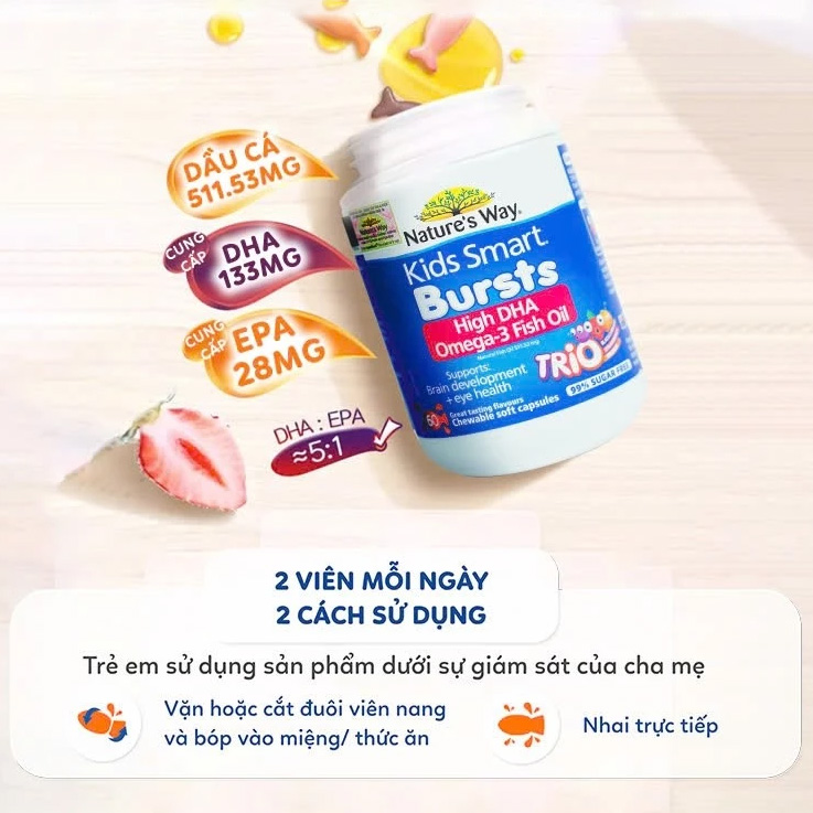 ✨Viên Nhai DHA Cho Bé Nature's Way Kids Bursts High DHA Omega 3 Fish Oil Trio Hỗ Trợ Bổ Não, Bổ Mắt, Vị Trái Cây 60 Viên/Hộp