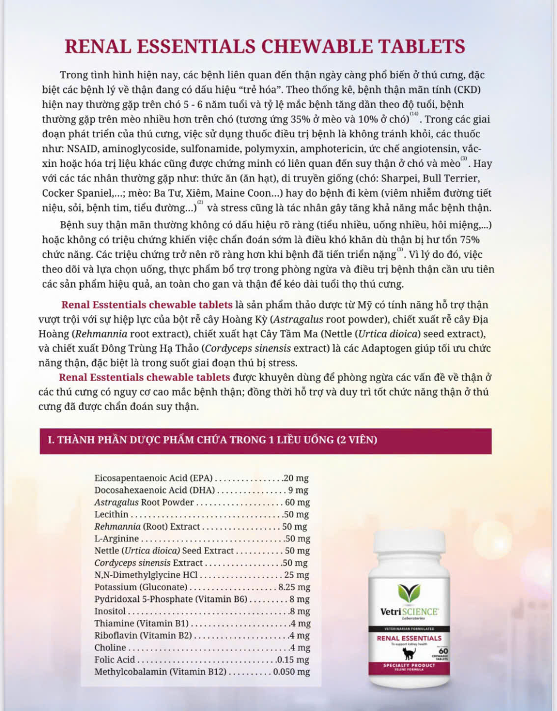 Sản phẩm được dùng trong các trường hợp: Tăng cường chức năng thận. Hỗ trợ cải thiện tuần hoàn máu đến thận. Duy trì chức năng tế bào. Chó và mèo cần tăng cường sức khỏe và chức năng thận. C...