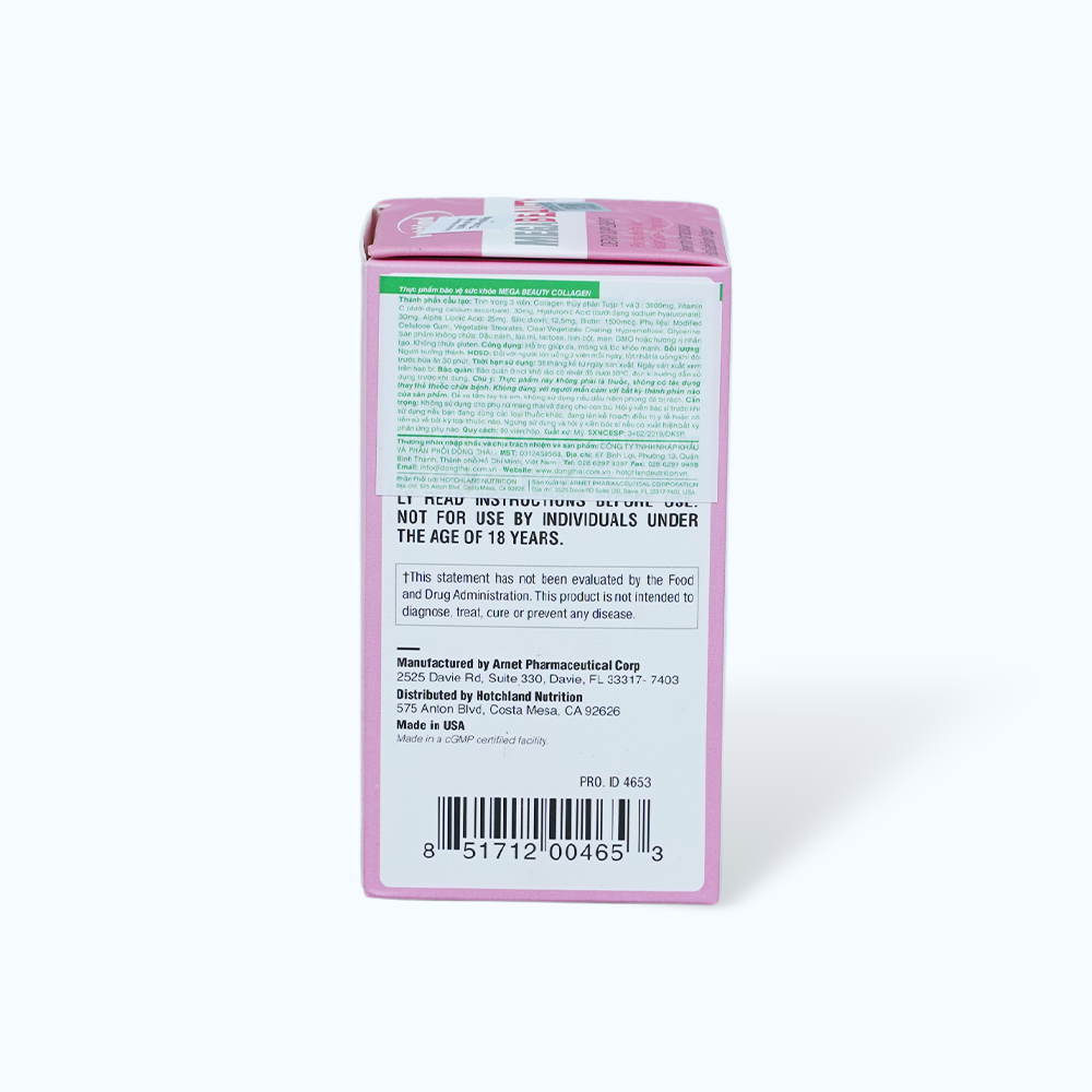 - Alpha Lipoic Acid 25 mg, Biotin 1500 mcg, Silic dioxit Phụ liệu Modified Cellulose Gum, Vegetable Stearates, Clear Vegetable Coating: Hypromellose, Glycerine. Trong sản phẩm không chứa Đậu nành, lúa mì, lactose, tinh bột, men, GMO, hoặc hương vị nhân tạo. Không chứa gluten. Công dụng của Viên uống Hotchland MegaBeauty Sản phẩm mang lại những tác dụng như: