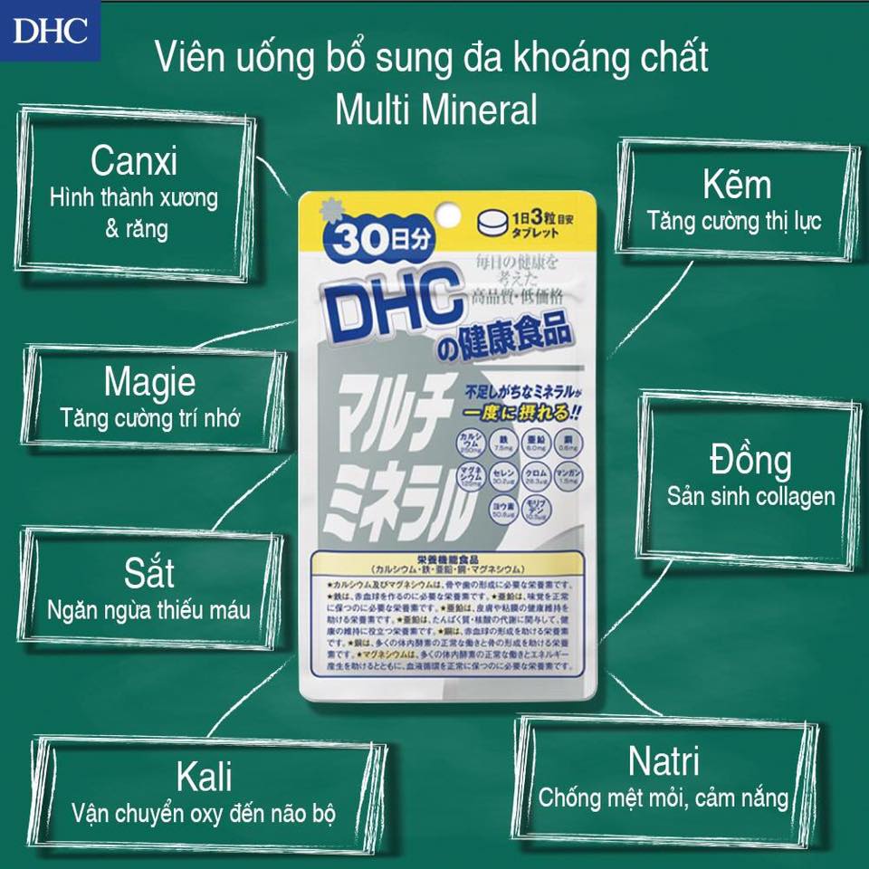 Thực phẩm chức năng viên uống khoáng tổng hợp DHC Multi Minerals bổ sung 10 loại khoáng chất mà cơ thể dễ bị thiếu hụt: canxi, sắt, kẽm, đồng, magie, crom, selen, mangan, molybdneum, iot.