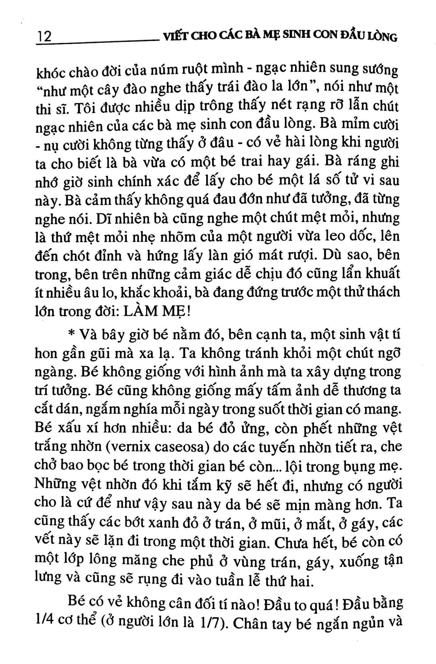 Ai chẳng có lần đầu tiên? Lần đầu đi xem phim, lần đầu xa cha mẹ, lần đầu biết yêu thương? Những cái lần đầu tiên như thế thật để lại trong ta bao nhiêu cảm xúc khó tả: vừa vui, vừa bỡ ngỡ, vừa lo sợ sẽ gặp phải sai sót nào đó. Với các bậc làm cha mẹ cũng vậy, đặc biệt là với các bà mẹ sinh con đầu lòng. Cái cảm giác đột nhiên trong mình mang một sinh linh bé nhỏ thật vô cùng thú vị không thể diễn tả nên lời; vừa hạnh phúc vì lần đầu được làm cha, làm mẹ; vừa lo lắng bởi cái lần đầu tiên này hoàn toàn khác với những lần đầu tiên mà họ đã trải qua. Làm mẹ là bản năng của người phụ nữ nhưng như thế không có nghĩa là họ sẽ không có sai sót gì. "VIẾT CHO CÁC BÀ MẸ SINH CON ĐẦU LÒNG" là món quà mà bác sĩ Đỗ Hồng Ngọc muốn gửi đến những người làm cha, làm mẹ lần đầu tiên.