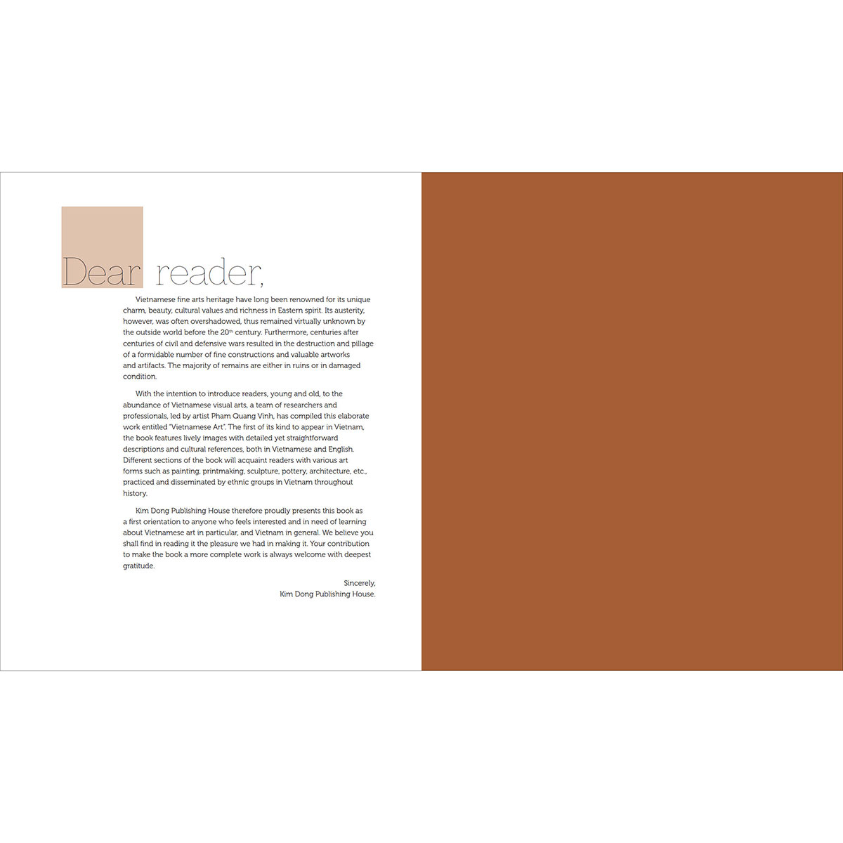 Kim Dong Publishing House therefore proudly presents this book as a first orientation to anyone who feels interested and in need of learning about Vietnamese art in particular, and Vietnam in general.