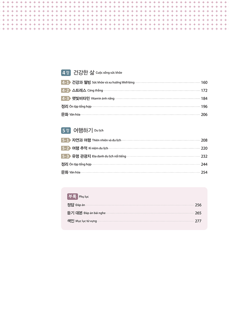 Phần ôn tập giúp người học có thể tự đánh giá quá trình học của mình sau mỗi 3 bài. Đầu tiền, người học có thể kiểm tra khả năng từ vựng, cấu trúc ngữ pháp và trên cơ sở đó, có thể kiểm tra nội dung học tập thông qua các câu hỏi về kỹ năng ngôn ngữ cũng như các câu hỏi theo dạng đề TOPIK.