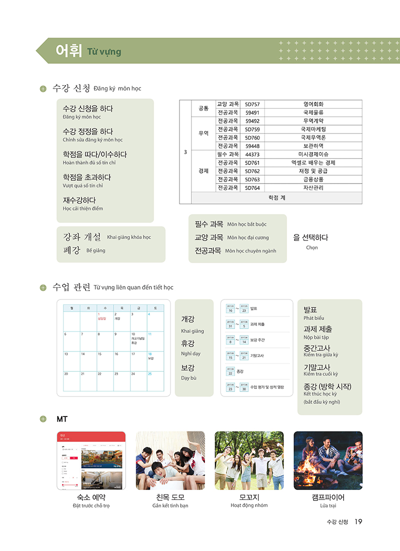 Người học sẽ được học kỹ năng giao tiếp tiếng Hàn thông qua những đoạn hội thoại mẫu được xây dựng theo từ vựng và cấu trúc ngữ pháp theo chủ đề của mỗi chương.