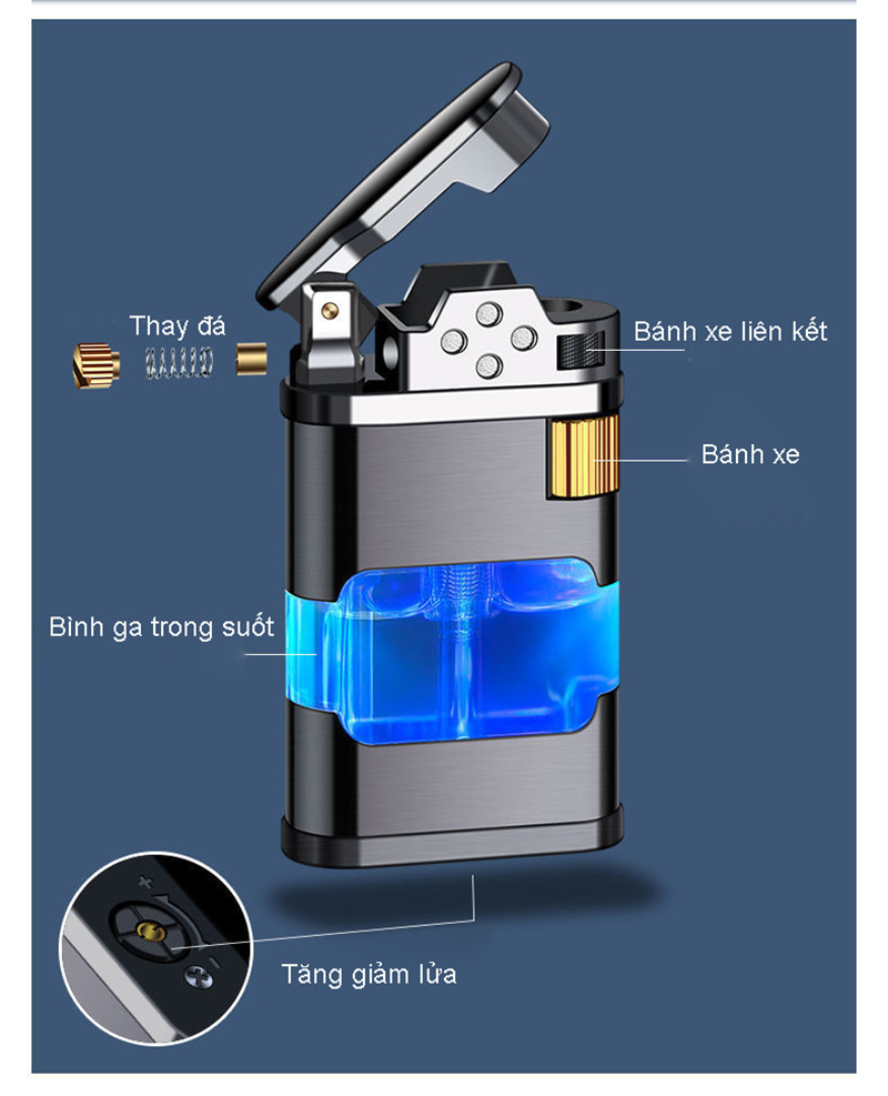Đặc điểm: Khác Với Các Mẫu Gas Thông Thường, Mẫu Bật Lửa Gas Lộ Thiên Có Đèn Led Phát Sáng Với Thiết Kế Sang Trọng, Phá Cách Khi Khởi Động Có Chế Độ Đèn Led Phát Sáng. Thân Bật Lửa Thiết Kế Trong Suốt Giúp Người Dùng Quan Sát Rõ Lượng Gas Bên Trong Để Chủ Động Nạp Thêm Khi Cần Thiết. Đây Là 1 Chiếc Bật Lửa Khác Biệt Cho Anh Em Sưu Tầm. Bật Lửa Chắc Và Cầm Nặng Tay.