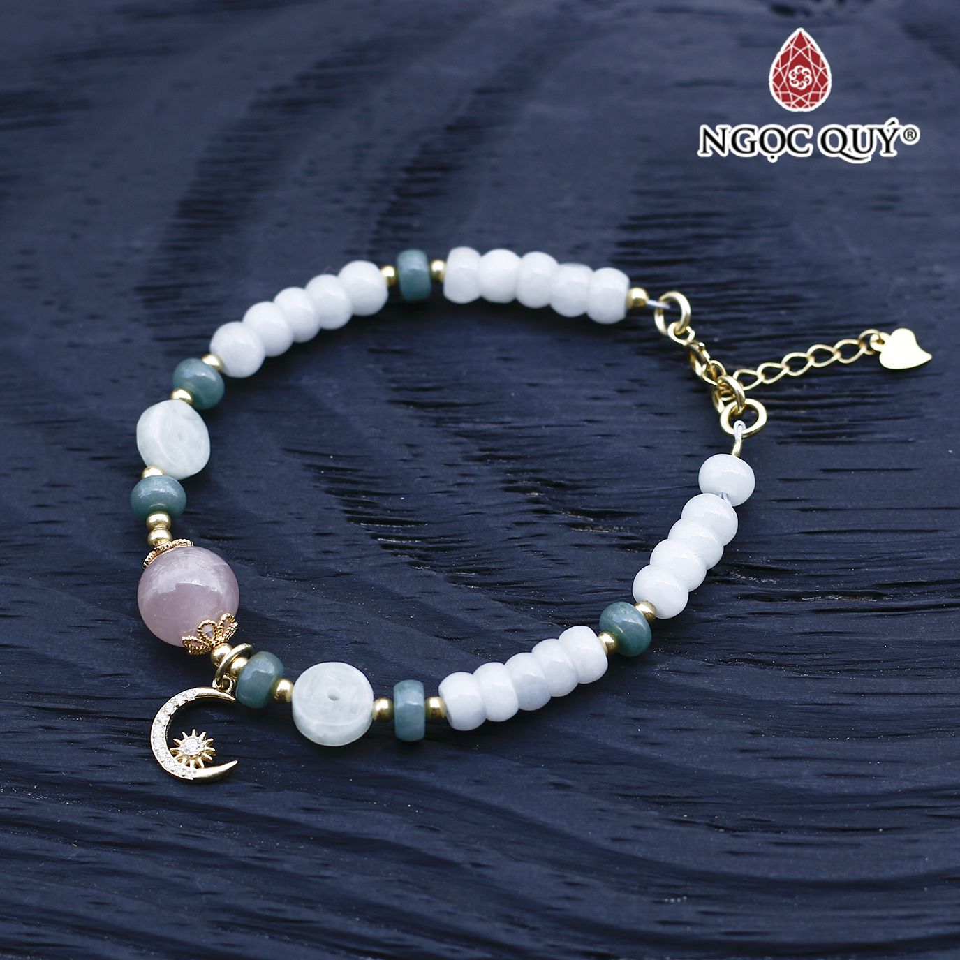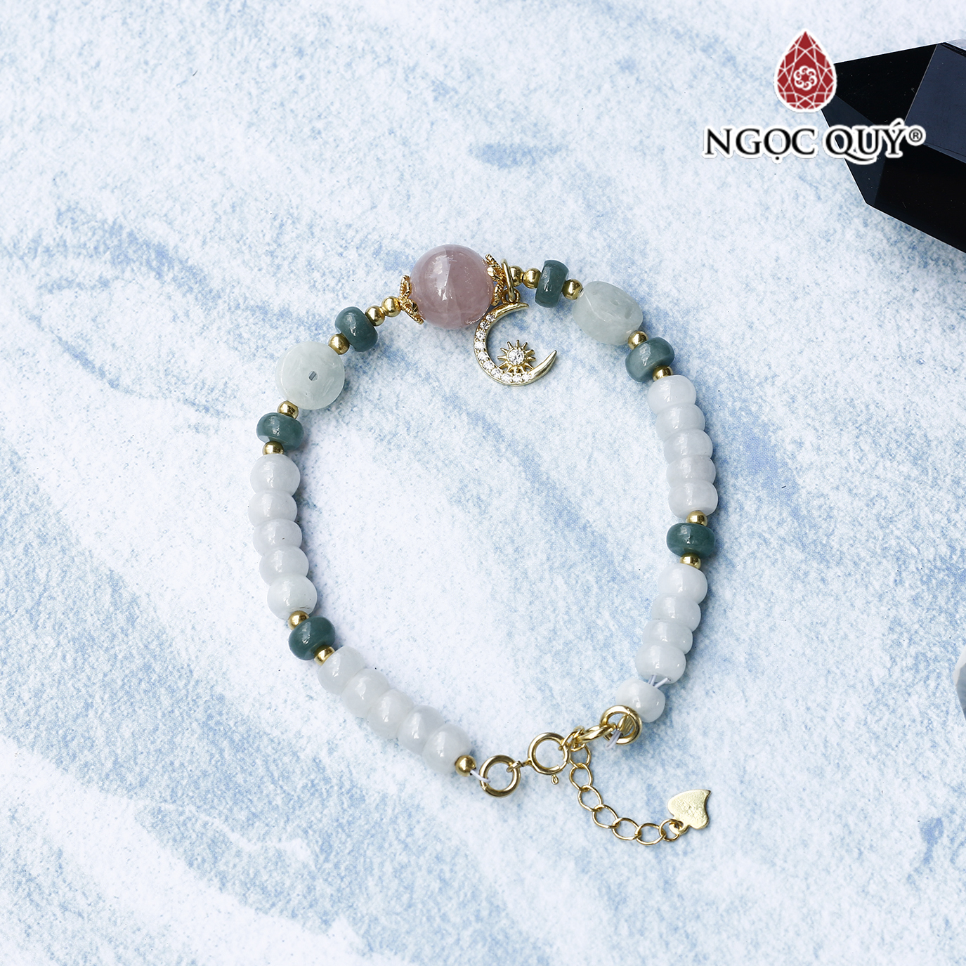 - Vòng Tay Thạch Anh Dâu Mix Tím Ngọc Charm Hoa Mặt Trời Ngọc Quý Gemstones VT109 mang màu hồng nhẹ nhàng, chứa năng lượng bổ trợ mạnh mẽ về tình duyên, cải thiện các