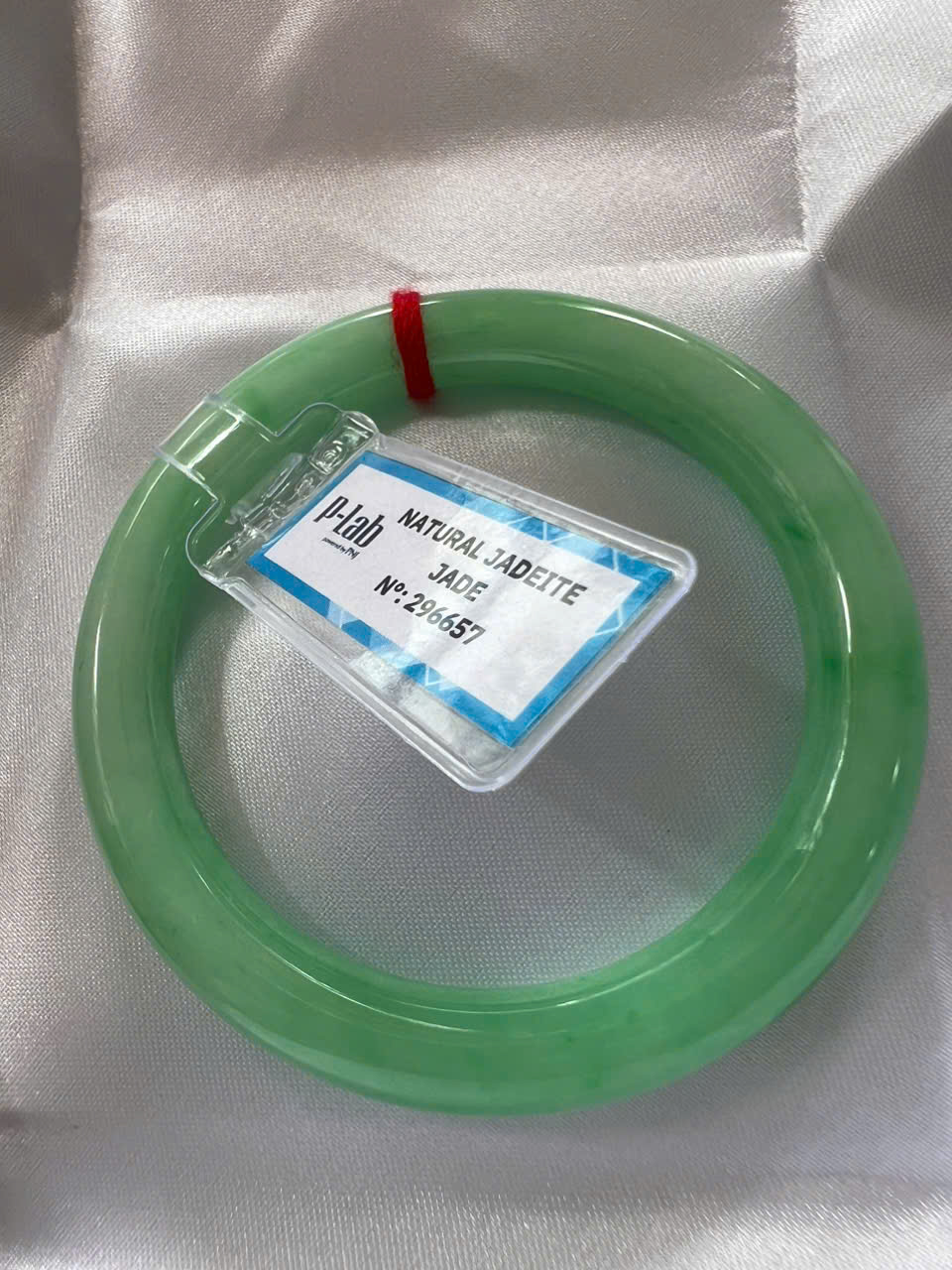 Vòng Cẩm Thạch Tự Nhiên Kiểm Định P Lab No 296657 Vip Sịn Ni 52mm x Chột 8mm Màu Xanh Lý Trắng nhẹ đều bóng mượt các Chị tay lên tay đẹp xuất sắc sịn sang xinh lắm nữ 50kg - 56kg đeo ạ