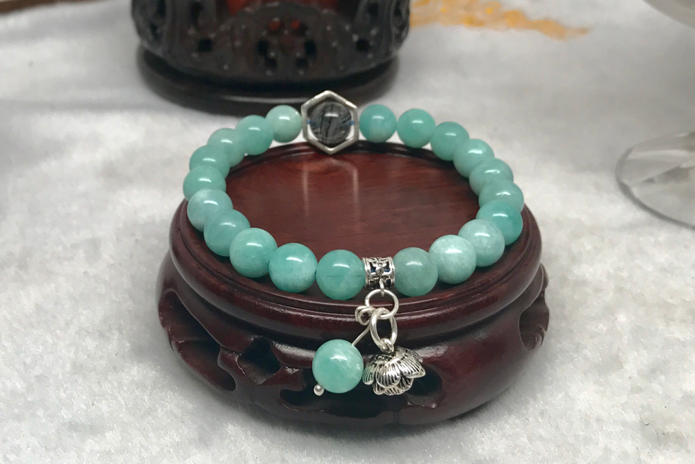 - Vòng Đá Amazonite Mix Charm Hoa Sen Bạc Ngọc Quý Gemstones VPT043 được làm từ đá amazonite được hình thành trong tinh thể lăng trụ, có màu xanh ngọc đặc trưng giống màu biển. -