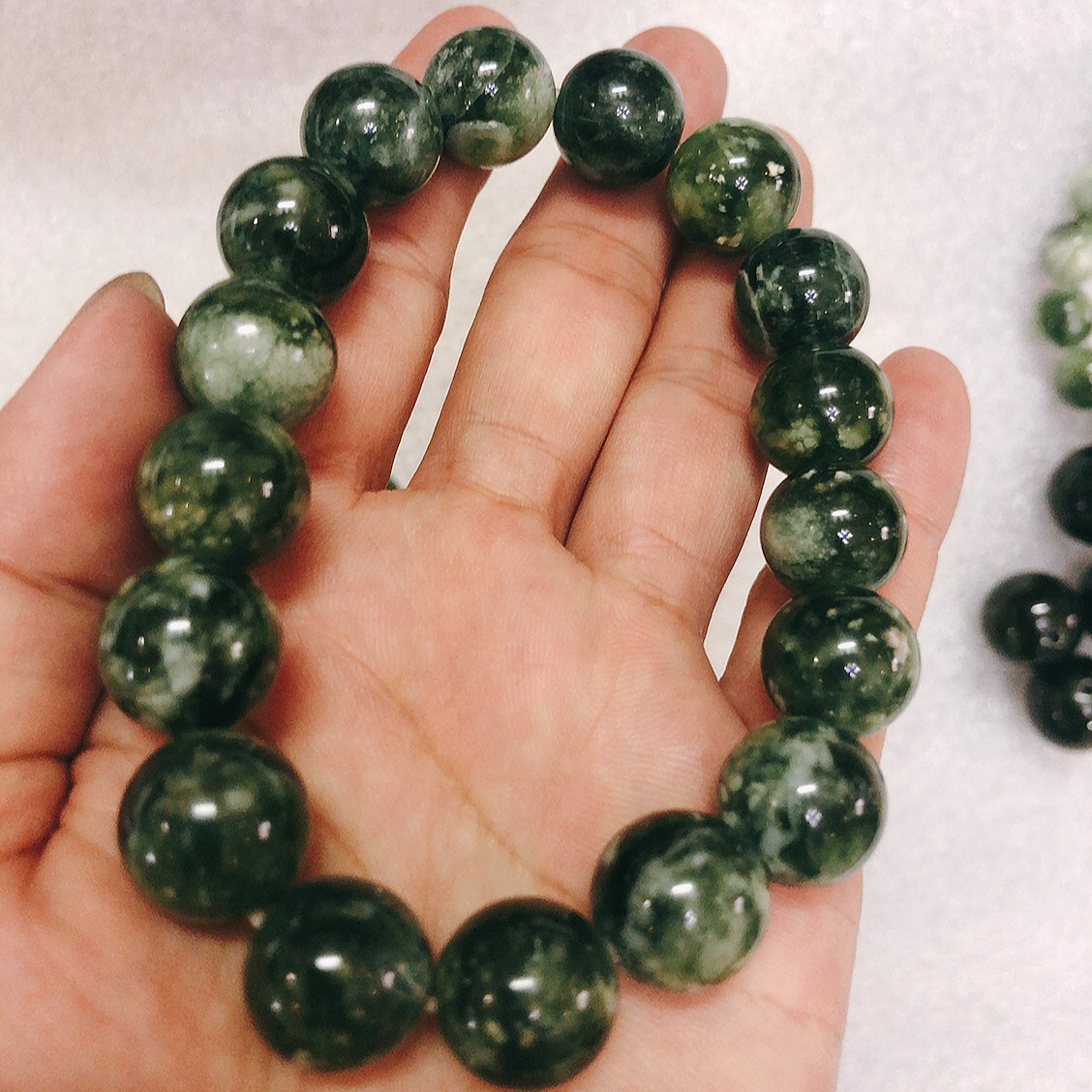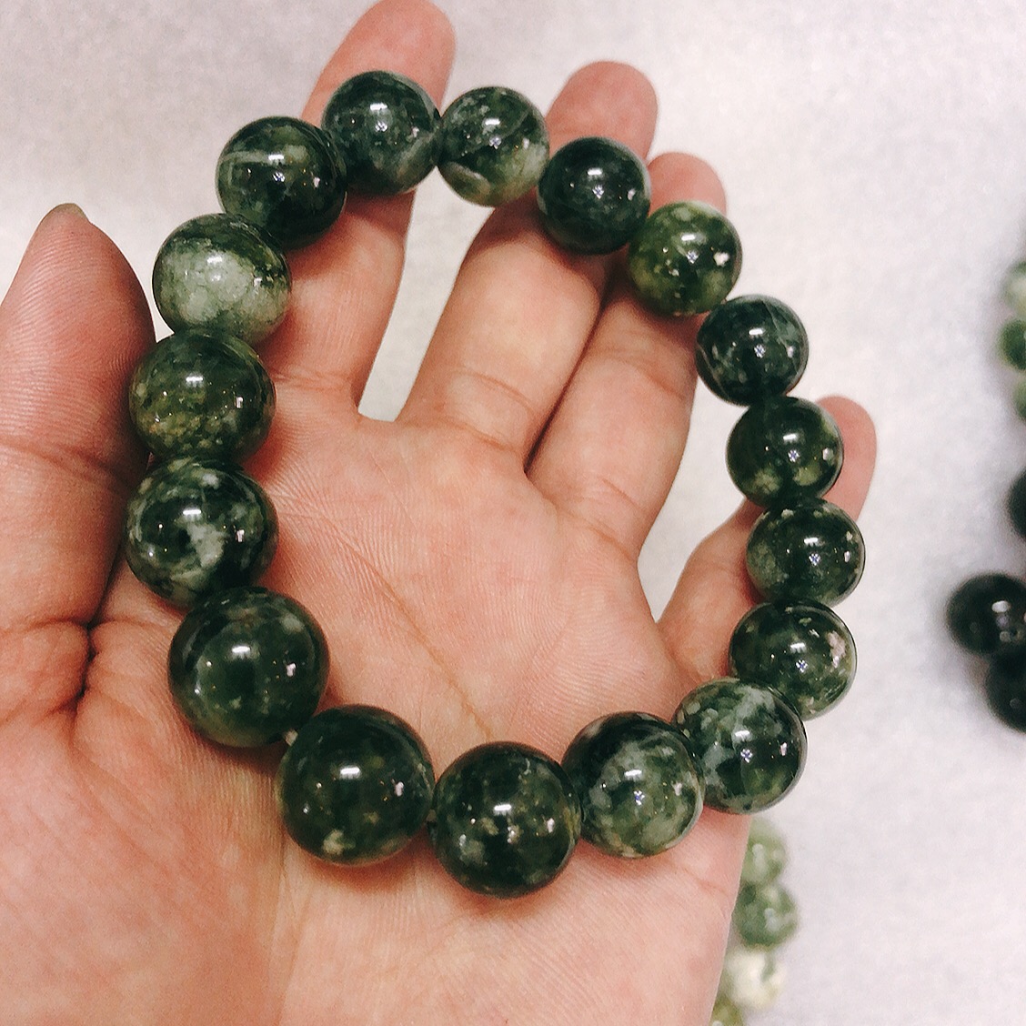 Chất liệu: đá ngọc serpentine 100% của Việt Nam Kích thước: Li hột là 17 li (1.7 cm) màu xanh lá đen bóng tinh khiết Dùng để đeo tay hoặc để lần tràng hạt khi