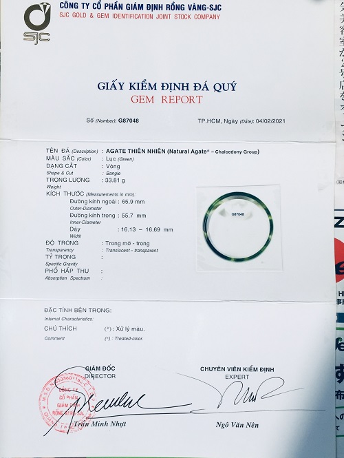 Bộ sản phẩm: 01 Vòng tay + 01 Bản Photocopy giấy kiểm định mẫu tại SJC LAB + 01 Túi Nhung Cung Hỷ lót Nhung
