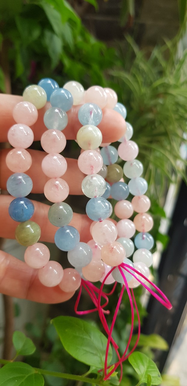 Vòng tay chuỗi đá Beryl tự nhiên đa sắc màu tươi sáng bóng mượt đẹp size hạt 9mm là sự phối hợp tông màu hồng ngọt ngào với xanh dương xanh nước biển đậm nữ đeo tay đẹp xinh tay may mắn tốt cho sức khỏe công việc tài lộc