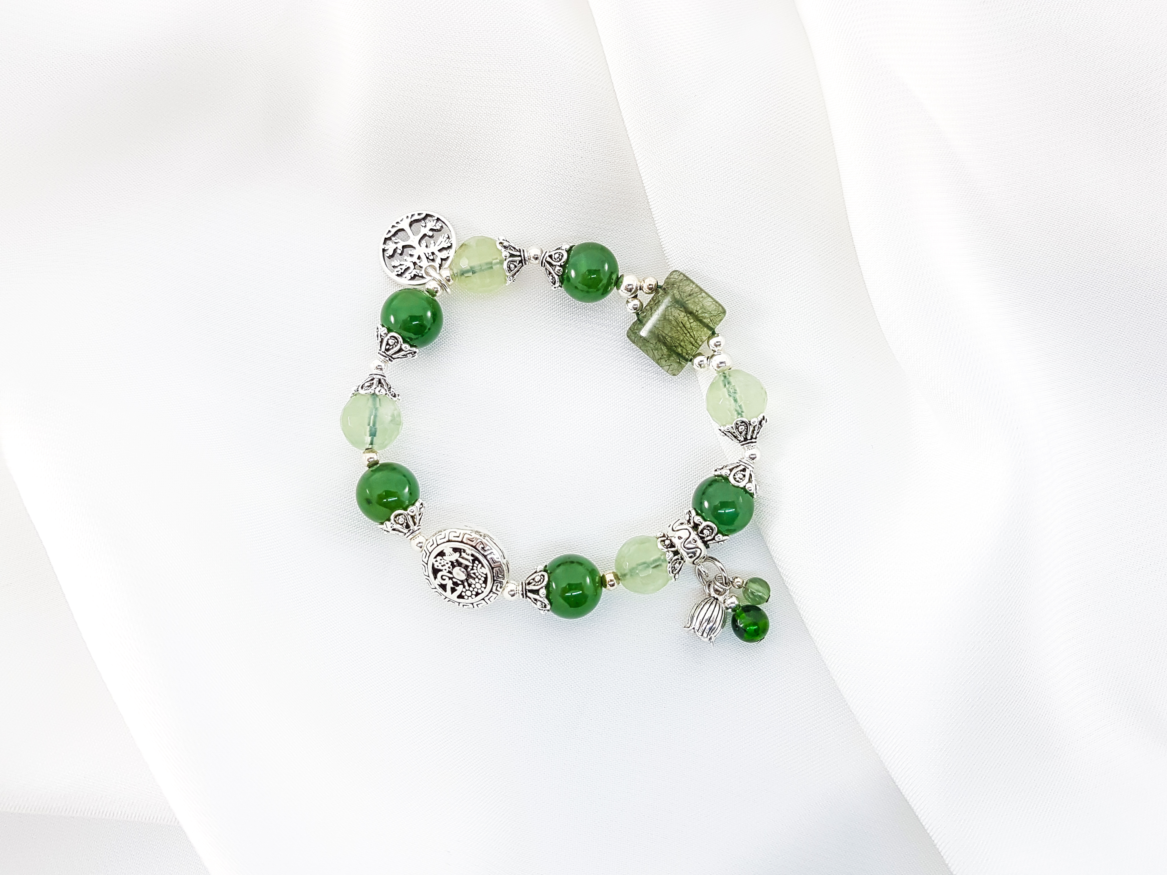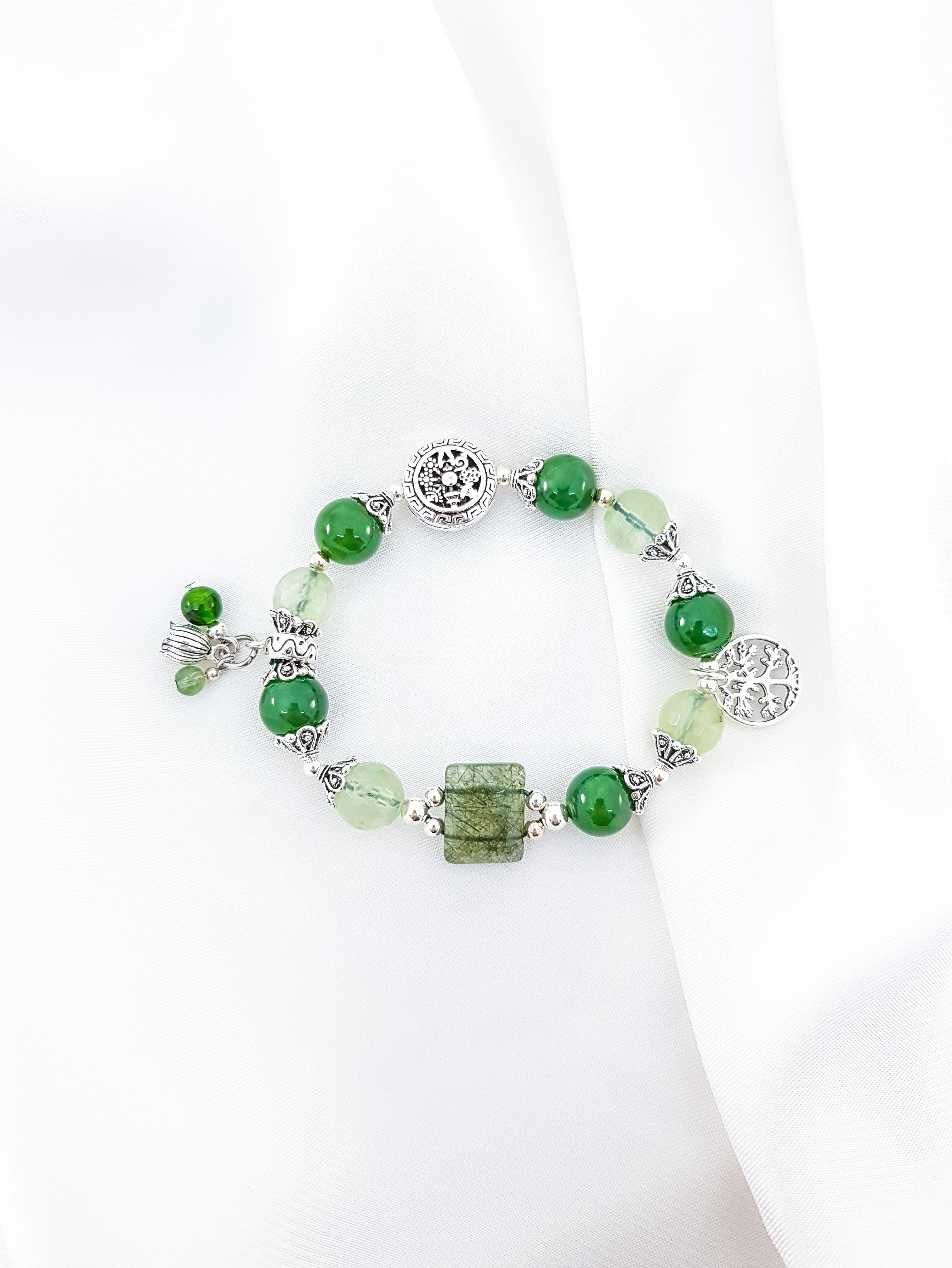 Vòng Thạch Anh Ưu Linh Xanh Phối Hoa Thạch anh xanh Đá Thạch Anh Xanh (Green Aventurine) còn được gọi là “Đá của Cơ Hội”, nó được cho là loại đá mang lại may mắn